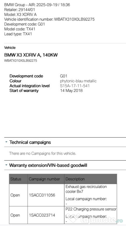 *Seria mașinii se regăsește in poze in facturile și istoricul de service de la reprezentanțele BMW. Ofer transparență totalã și cer seriozitate.