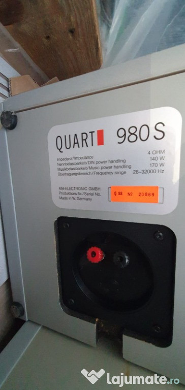Boxe Mb Quart 980 S. sunt seria a II-a fabricate doar intre 1986-1990, cu catifea deasupra, iar pretul la lansare(3200DM) spune multe despre calitatea acestor incinte. Dealtfel despre sunetul acestora gasiti referinte destule pe net.Mentionez ca boxele sunt ingrijite, nedesfacute vreodata, totul original, cu mici urme ale trecerii timpului care am incercat sa le evidentiez in poze. Mai jos detalii tehnice pentru cunoscatori . Datorita greutatii as prefera predare personala (Constanta, Tulcea, Braila, Galati, Vrancea, Buzau).Boxe compresie cu un sunet puternic, deosebit de detaliat ,clar ,scenă acustică.