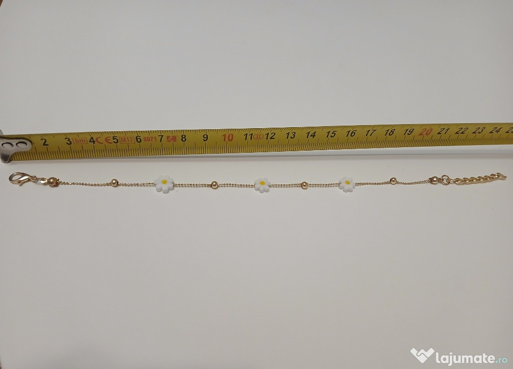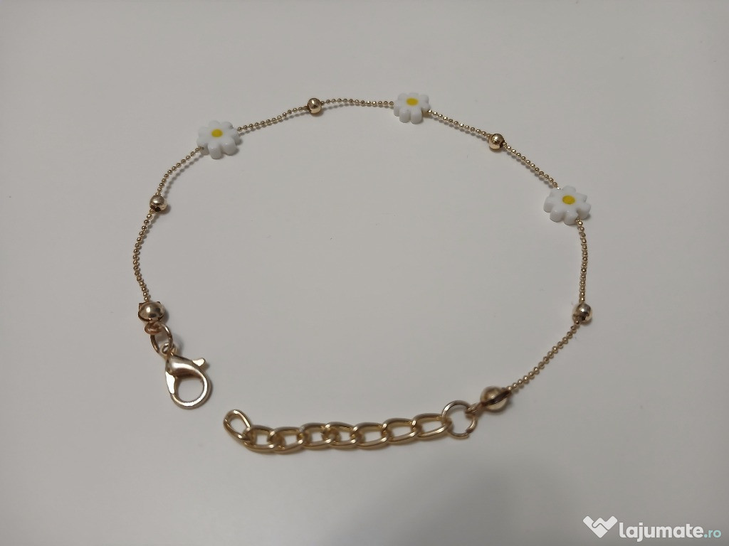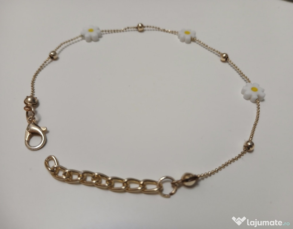 Bratara de dama din metal comun de culoare aurie, cu accesorii sub forma unor flori de culoare alba.Are lungimea totala de aproximativ 25 de centimetri, dar marimea sa este adaptabila deoarece are in capat mai multe zale pe care poate fi prinsa incuietoarea.