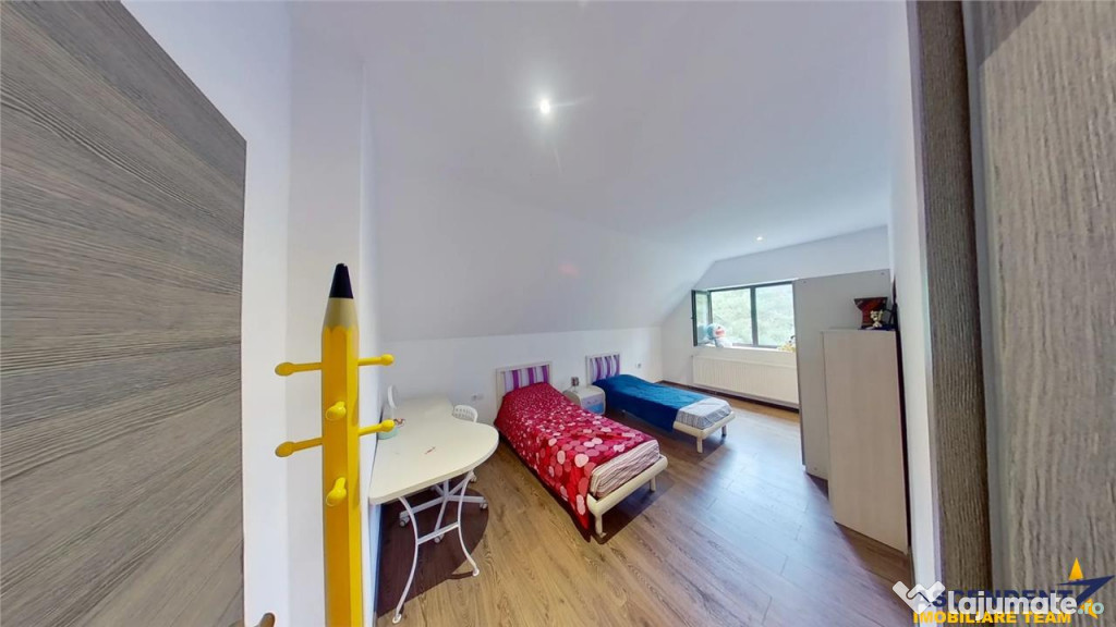 Este o constructie primitoare, cu detalii asezate intr o cromatica aliniata cu aerul de cartier rezidential de munte, care te invita la introspectie, lasand oportunitatea de personalizare din partea viitorului proprietar pentru ai da destinatia pe care o doreste ( locuinta rezidentiala, azil de batrani, pizzerie ( la parter este utilata in totalitate pentru aceasta, cu aparatura profesionala sigilata), etc.