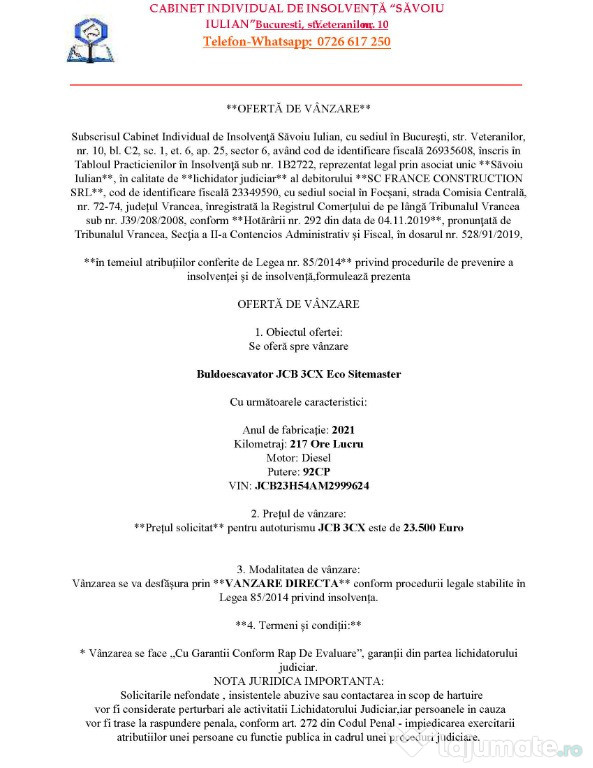 Anuntul Buldoescavator JCB 3CX 220 Ore An 2021 testare/transport gratis este adaugat de pe LaJumate.ro.