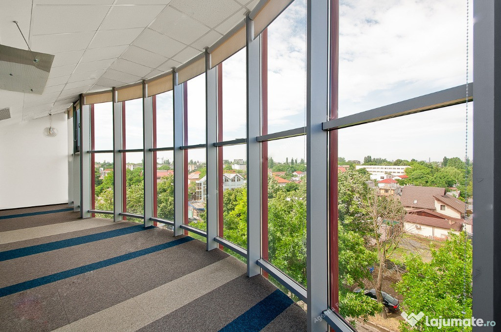 Cladire din sticla construita in anul 2003. Dispune de urmatoarele dotari si finisaje: structura pe cadre si plansee din beton armat, pereti de separare din bca & rigips, inaltime spatiu de 3 m, perete cu lavabil, gresie, faianta si mocheta. Exista receptie, serviciu de paza, curatenie si de administrare a imobilului.