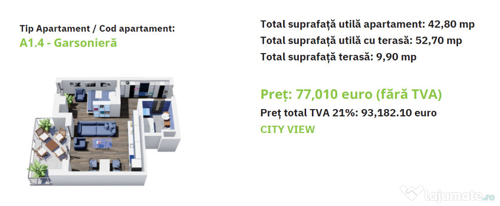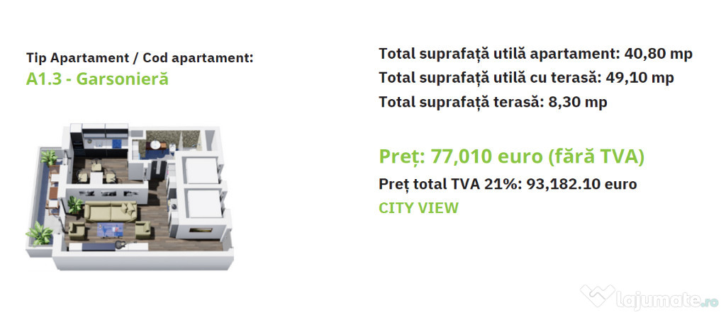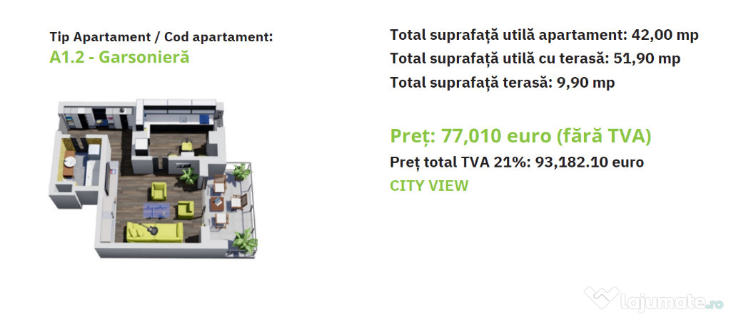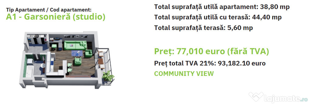 Prețul de vânzare al apartamentelor este de 93.182 euro (TVA inclus), iar comisionul către agenție este 0%.