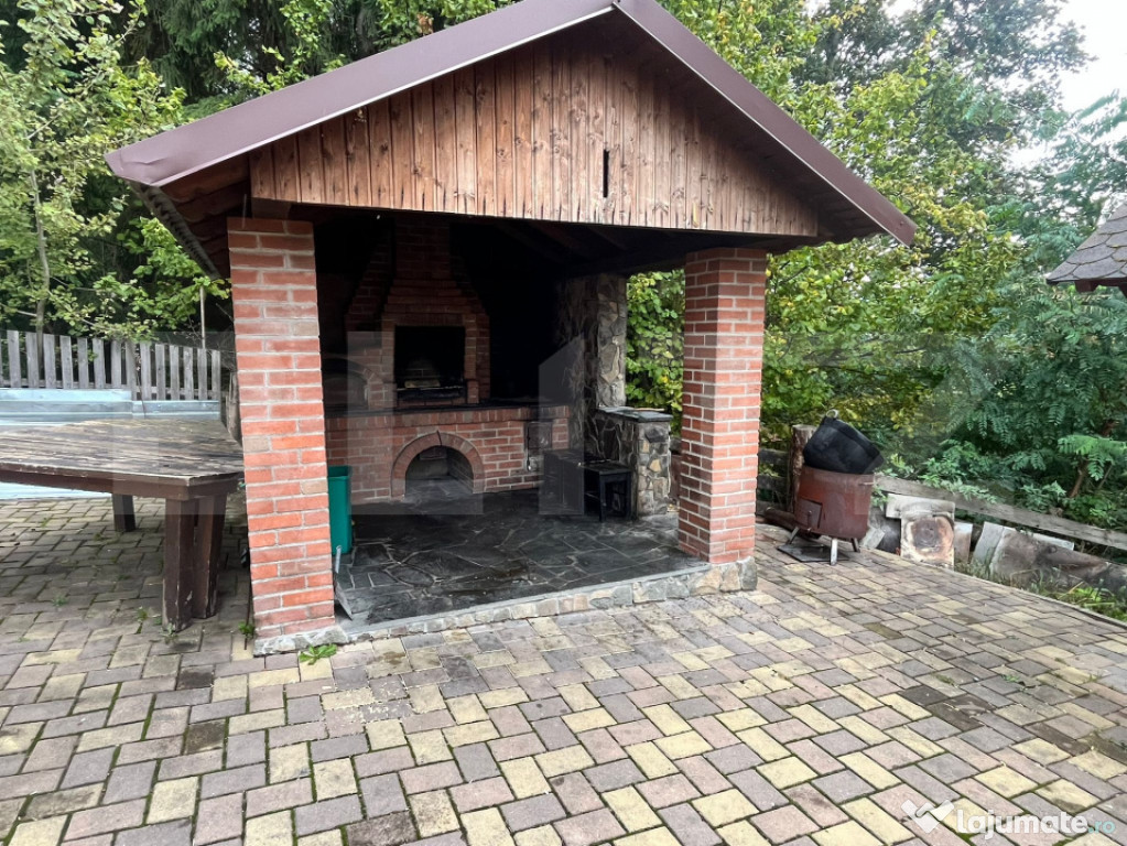 Terasă exterioară cu grătar, ciubăr și foișor cu loc de luat masa