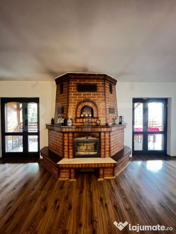 Living spațios cu șemineu de mari dimensiuni și ieșire pe terasa exterioară