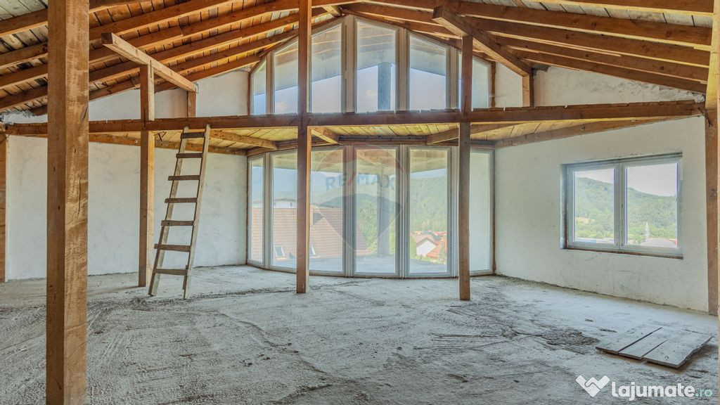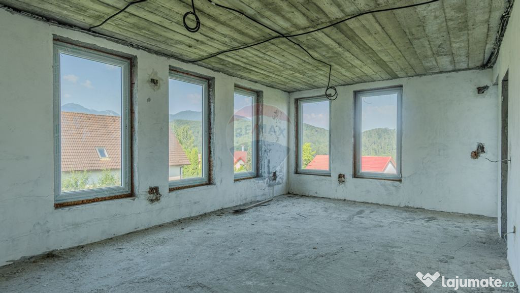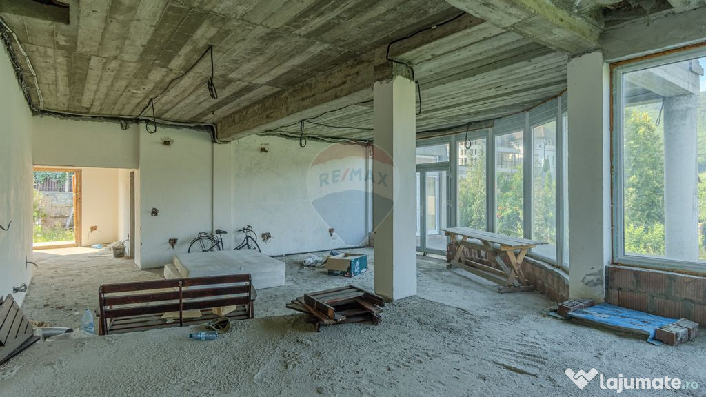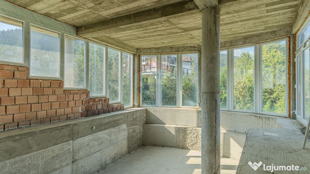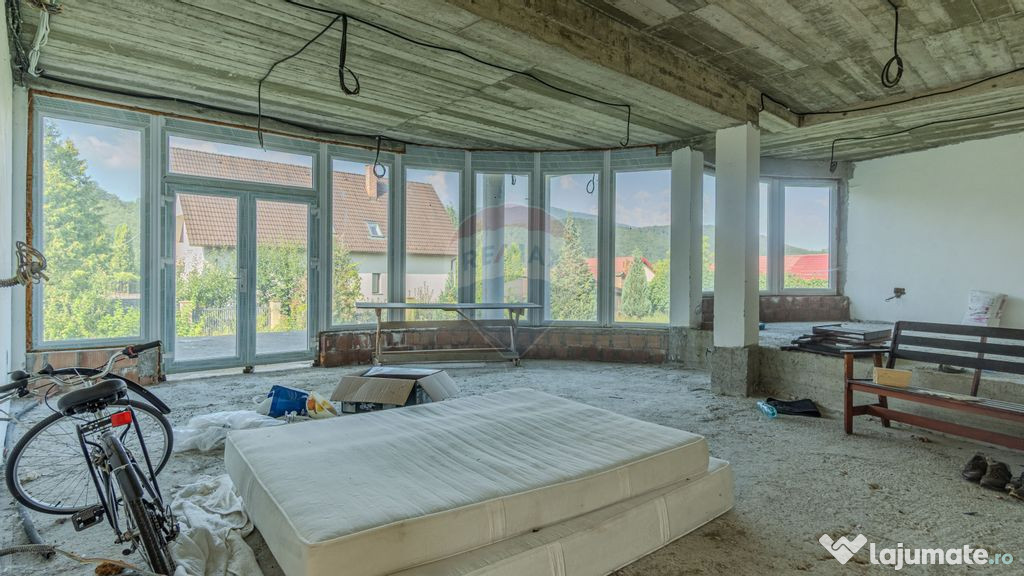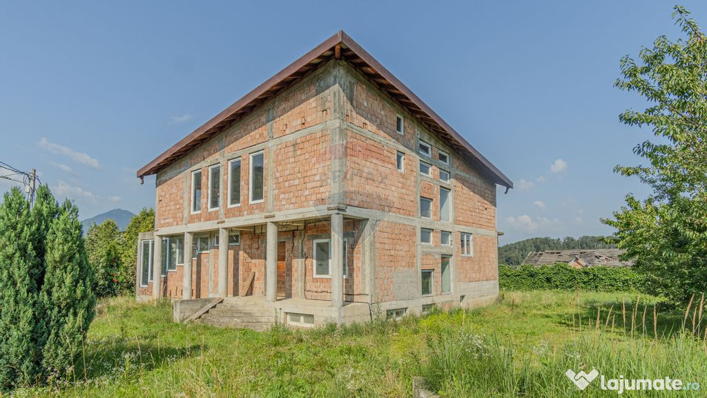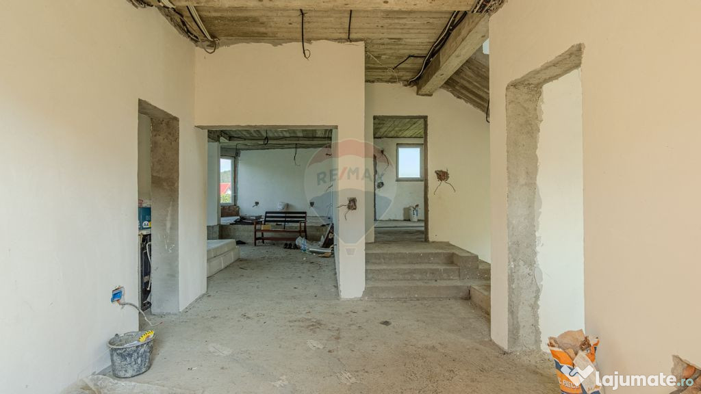 Structura este deja pregătită – fundație solidă, ziduri puternice, acoperiș sigur și tâmplărie exterioară montată. Patru niveluri (D+P+E+M), cu 219 mp construiți la sol în clădirea principală, plus o clădire secundară de 150 mp la sol (369 mp desfășurați) îți oferă spațiul perfect pentru orice vis îndrăzneț.