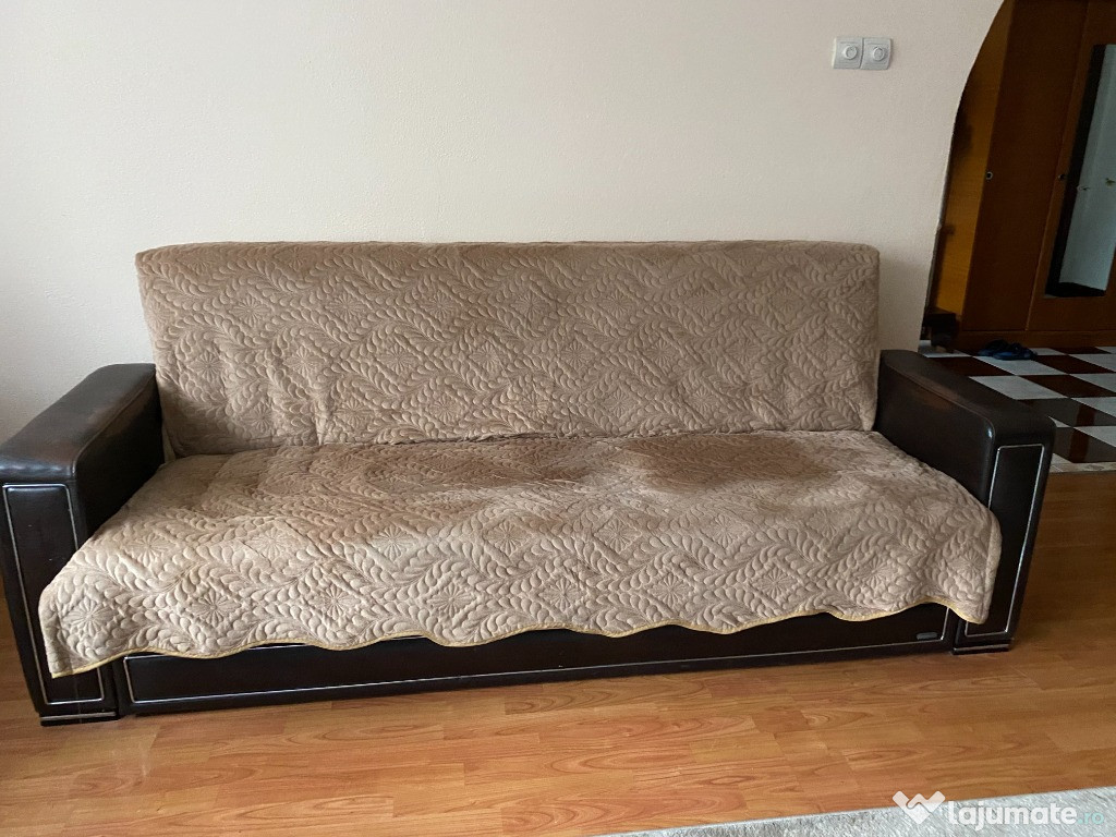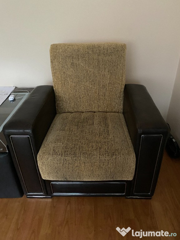 Vând canapea cu două fotolii, puțin folosite, tapițerie intactă, culoare bej cu cafeniu (sare și piper), inclusiv huse de protecție, preț 450 lei negociabil. tel. ascuns