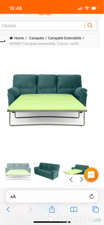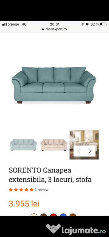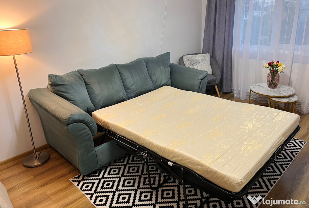 Canapea extensibilă Mobexpert, în stare bună de utilizare. Dimensiuni generoase, fara spatiu de depozitare. Culoarea verde se potrivește perfect în orice living modern. Ideală pentru relaxare și întindere.Anuntul Canapea Mobexpert este adaugat de pe LaJumate.ro.