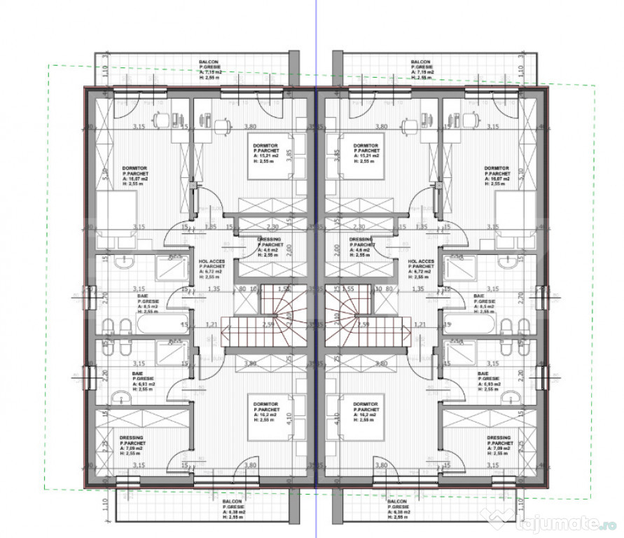 Etaj: 3 dormitoare, 3 băi, 2 dressinguri, 2 balcoane