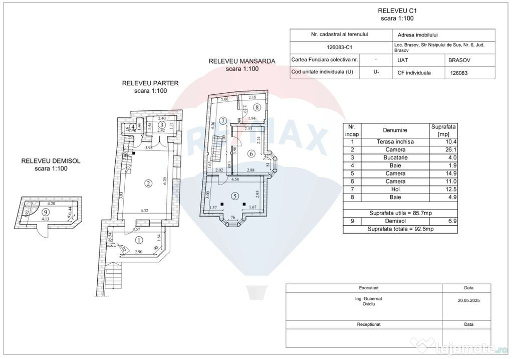- Suprafață utilă 85.7 mp, compusă dintr-un beci de 6.9 mp, parter, mansardă si pod. De asemenea, proprietatea dispune si de o terasa acoperita cu acces pe trepele alaturate casei, unde se poate accesa podul.