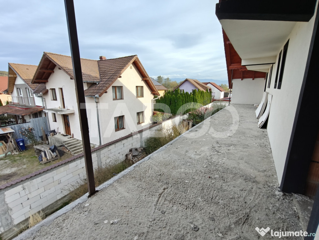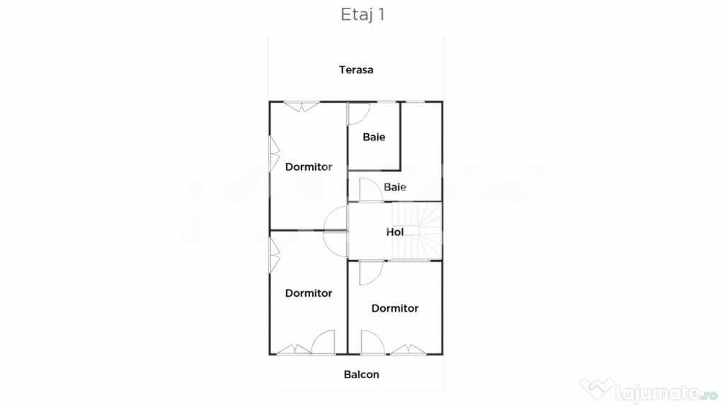 ~ Etaj: hol, doua dormitoare spatioase, un dormitor matrimonial cu baie proprie, o baie spatioasa cu geam de aerisire, un balcon de 10 mp si o terasa de 18 mp;