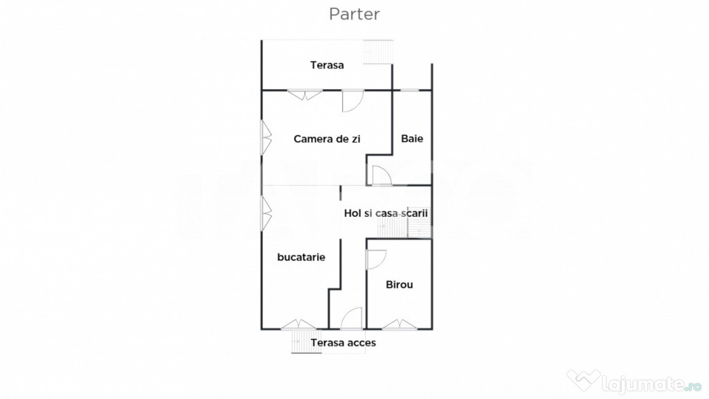 ~ Parter: un living spatios, o baie, o bucatarie open space, o camera pentru birou sau dormitor, un hol si o terasa de 10 mp;