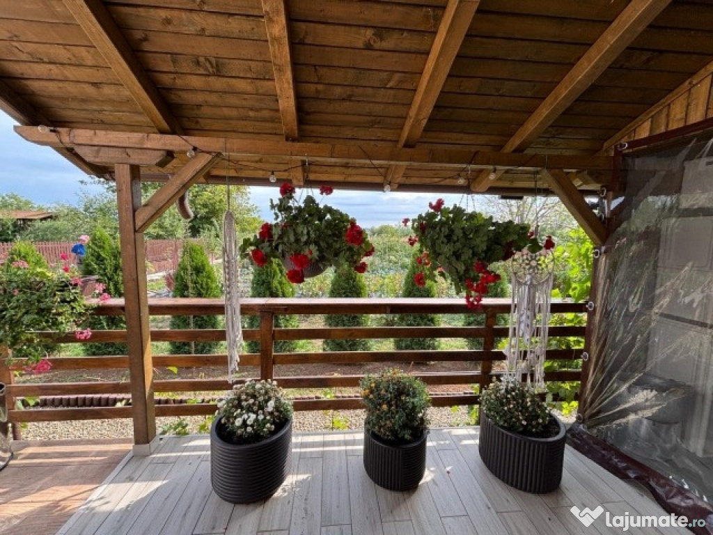 Foisorul este construit din lemn si caramida Brikston mobilat si utilat (plita ceaun,gratar,plita,cuptor pe lemne ,aragaz,frigider,balansoar,semineu pe gaz, chiuveta cu boiler electric,cismea), balansoar ,inchis cu folie cristal si plase de tantari cu o de suprafata56 mp.