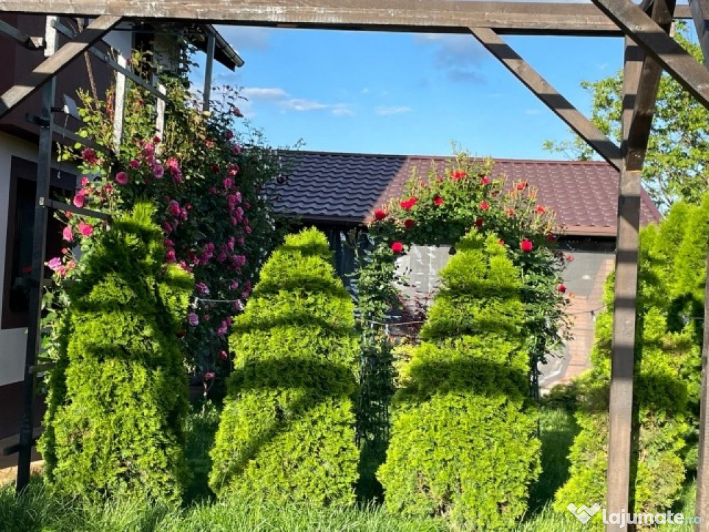 Suprafata totala de teren 996mp cu cultura de zmeuri remontanti,diversi pomi fructiferi,trandafiri dulceata,coacazi , muri,solar 24 mp ,sisteme de irigare prin picatura,gradina cu pergole transafiri cataratori ,tuia ,artar japonez si alte plante/ arbusti decorativi.