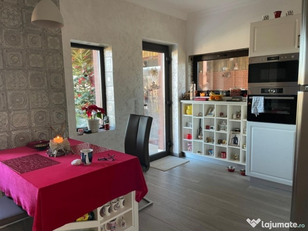 Dotari casa:centrala pe gaz BAXI ,incalzire pardoseala parter , geamuri tripan fourseason,mocheta ,parchet Tarkett ,gresie,faianta , usi Porta Doors ,3 unitati de AC de 12btu , termoizolatie exterioara 20 cm parter respectiv 40 cm etaj , pod izolat termic ( acoperiș si tavan etaj ).Mobila este achizionata de la Mobexpert si personalizata, electrocasnice Hotpoint, Bosch .
