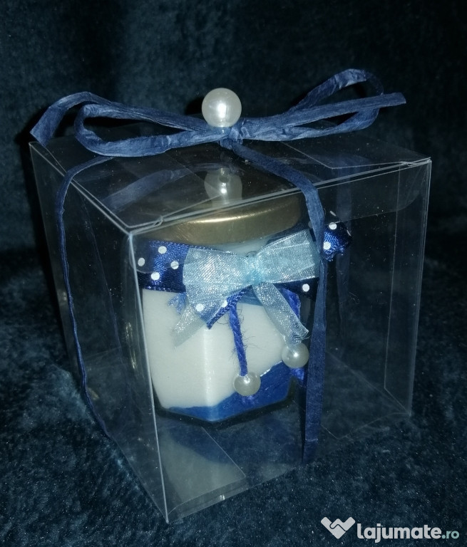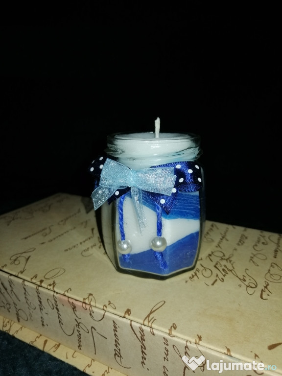Marturii de nunta sau botez - lumânare în borcanas 125 ml.Turnate și accesorizate manual. Culori : alb și albastru.
