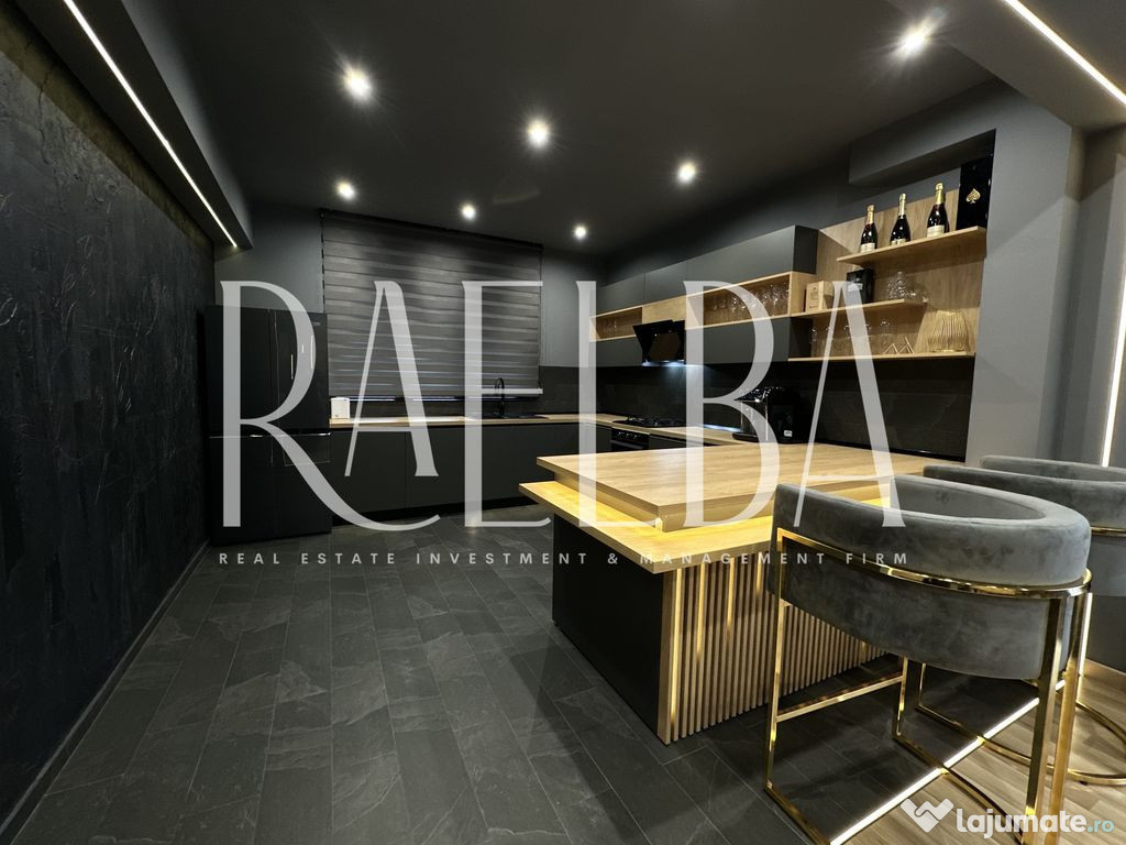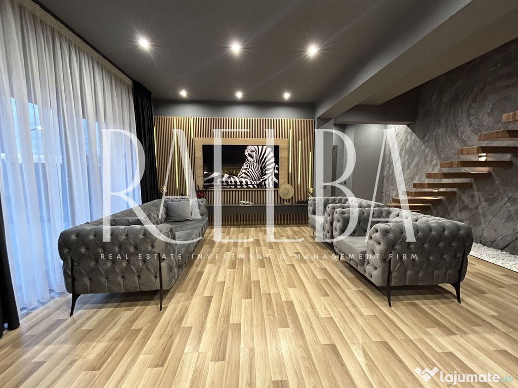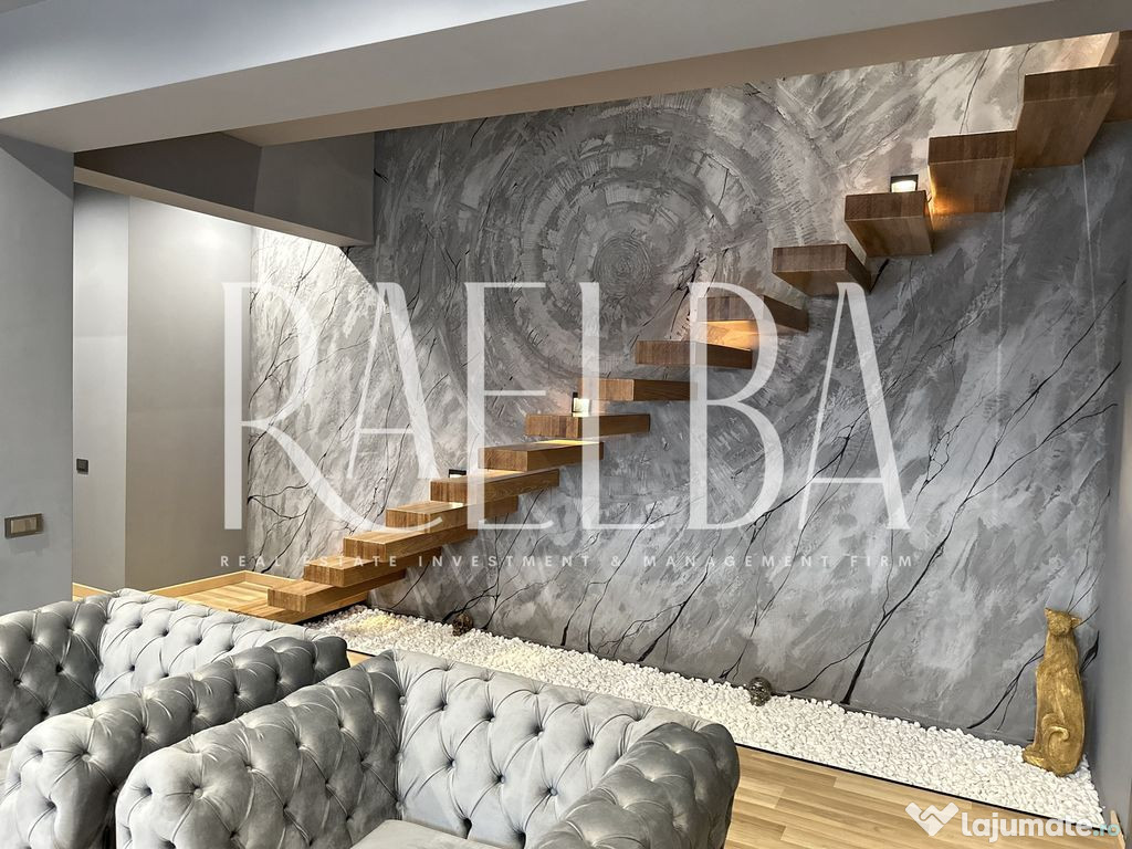 Interiorul continuă în aceeași notă modernă: finisaje premium, iluminare LED integrată, mobilier realizat la comandă și o scară spectaculoasă cu iluminare tactilă. Parterul oferă un living generos cu acces către terasa principală, o bucătărie open space complet echipată, o cameră ideală pentru birou cu acces la cea de-a doua terasă, o baie cu design contemporan și o cameră tehnică folosită ca spațiu de depozitare sau spălătorie.