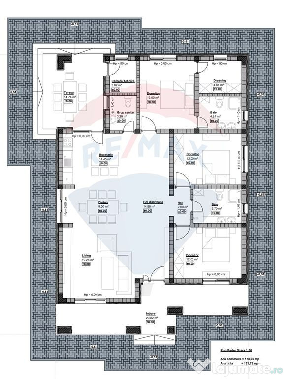 Compartimentarea imobilului este desfasurata astfel : living , dining , bucatarie , 2 bai , 3 dormitoare din care unul cu baie proprie si dressing , camera tehnica , terasa (vezi schita atasata).