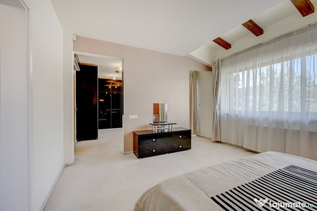 Etaj: în configurația actuală sunt două dormitoare foarte mari, ambele mobilate, și două băi. Inițial, la etaj au fost trei dormitoare, iar compartimentarea se poate reface foarte ușor dacă se dorește încă o cameră suplimentară.