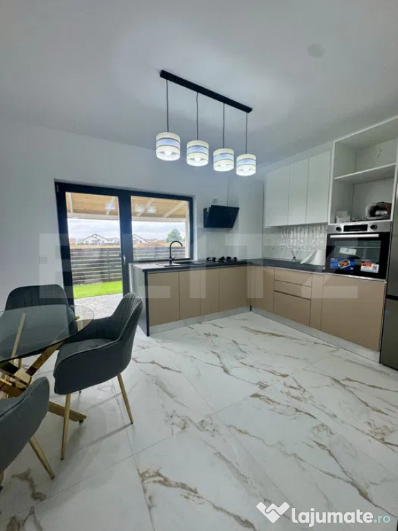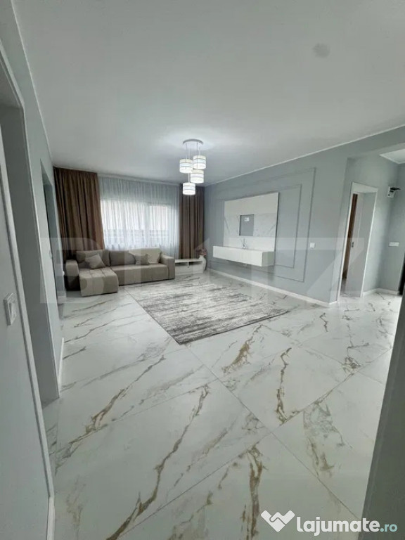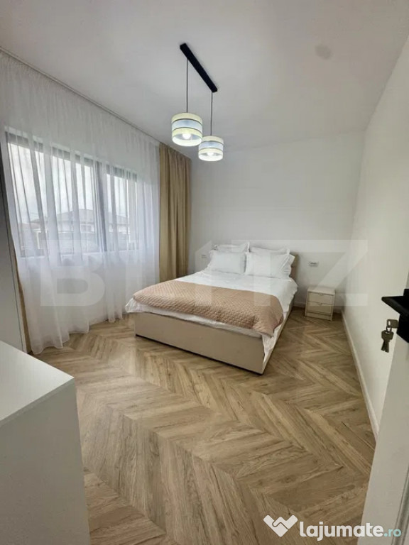 -Mobilată complet: dormitor matrimonial (pat king size, dressing walk-in, baie proprie), restul dormitoarelor mobilate, living complet, bucătărie utilată, terasa mobilată etc.