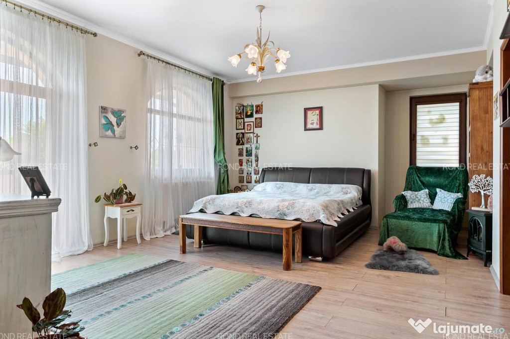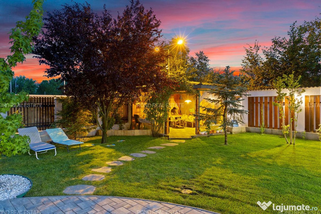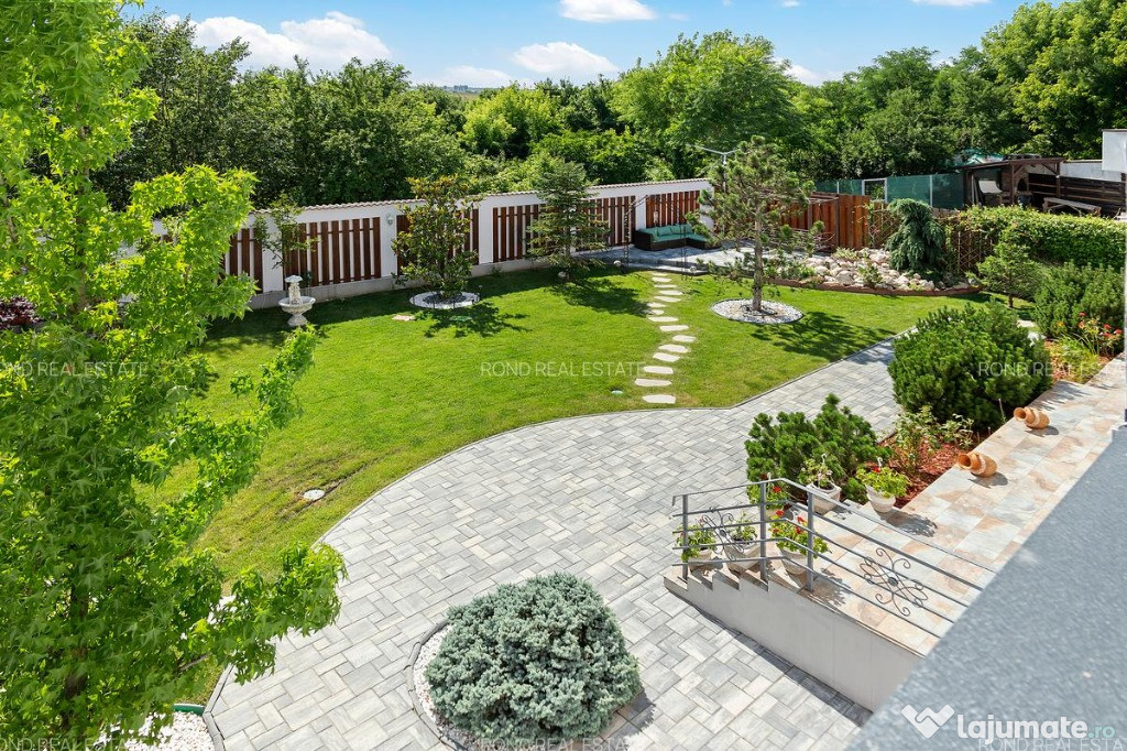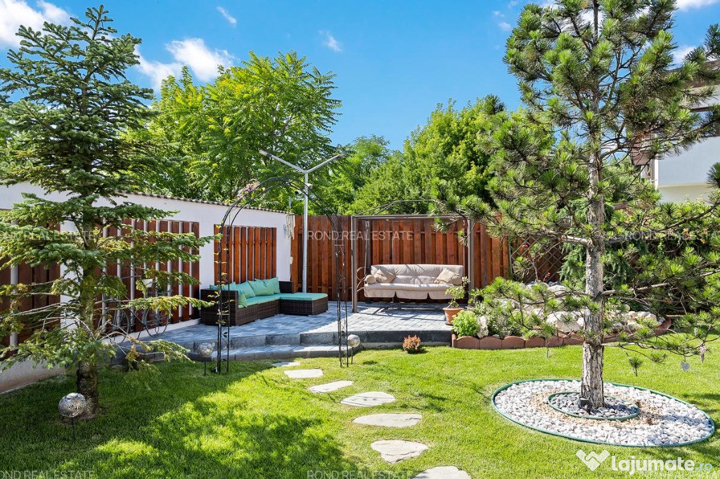 Confortul este dat nu numai de spațiul intern locativ generos, cu circulatii aerisite si inteligente, caracterizat prin suprafețe vitrate generoase și înălțimea camerelor, dar și de cel exterior – foișorul utilat (gratar, chiuveta, masa si scaune), curtea generoasă, grădina frumos amenajată în care întâlnești diferite specii de conifere, arbuști ornamentali, hortensii, trandafiri, magnolii, lavandă, 2 pomi fructiferi, 1 falnic stejar, câteva specii de brazi, arțar japonez.