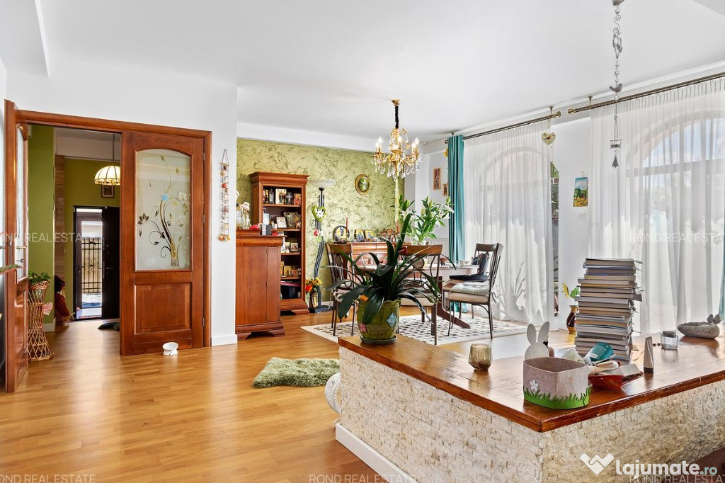 În zona de parter care se întinde pe o suprafață de 157 mp, se regasesc finisaje de calitate care îmbracă subtile note de rafinament. Zonele vitrate, pereții acoperiți cu vopsea decorativă, șemineul funcțional pe lemne, piatra naturală, toate aceste elemente împletite cu frumusețea și căldura lemnului din mobilier, întregesc un tablou care îmbie spre pace și armonie. Zona de zi se continua cu o terasa exterioara