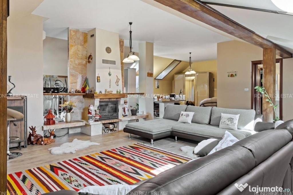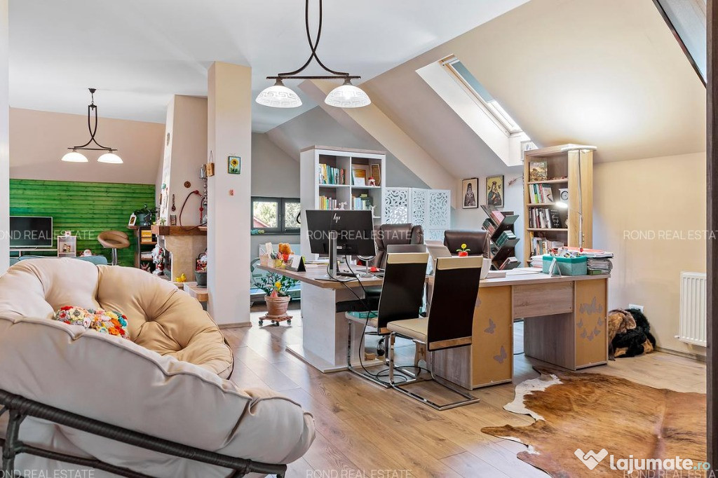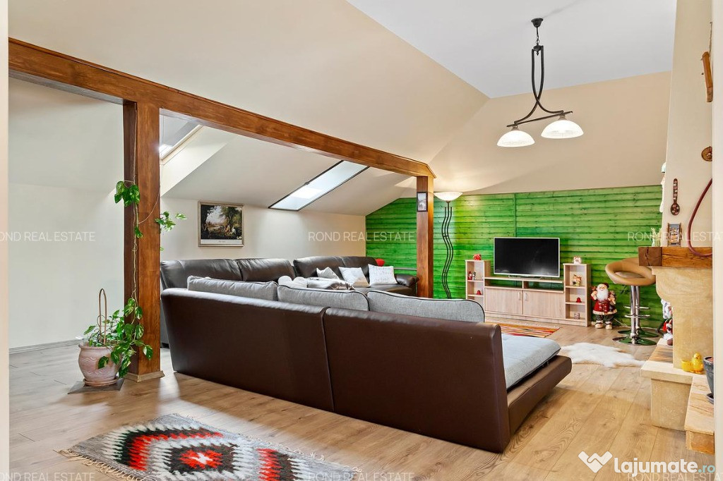 Mansarda, al cărui spațiu este generos, dispune de de 3 camere prevăzute cu 6 ferestre Velux, 1 dormitor cu baie proprie, un spațiu de depozitare, un șemineu pe lemne încastrat într-un perete de piatră naturală, grinzi din lemn natural, la care se adaugă un spațiu de zi deschis care poate fi amenajat ca spațiu de lucru, zonă de birou sau loc de joacă pentru copii. De mentionat este faptul că acest spatiu poate suporta o nouă recompartimentare.