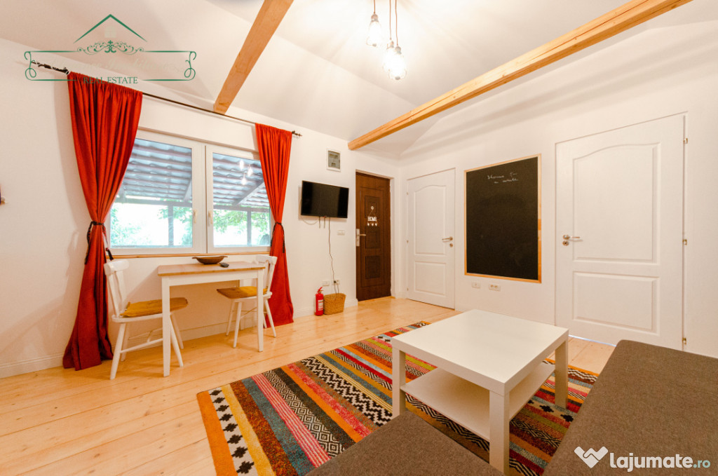 Compartimentarea optimă include două camere separate, un living generos cu bucătărie open space și o baie modernă cu duș. Interiorul este luminos și primitor, având pardoseală din lemn, grinzi aparente și accente de culoare ce creează o atmosferă caldă de cabană (așa cum se vede în imagini).