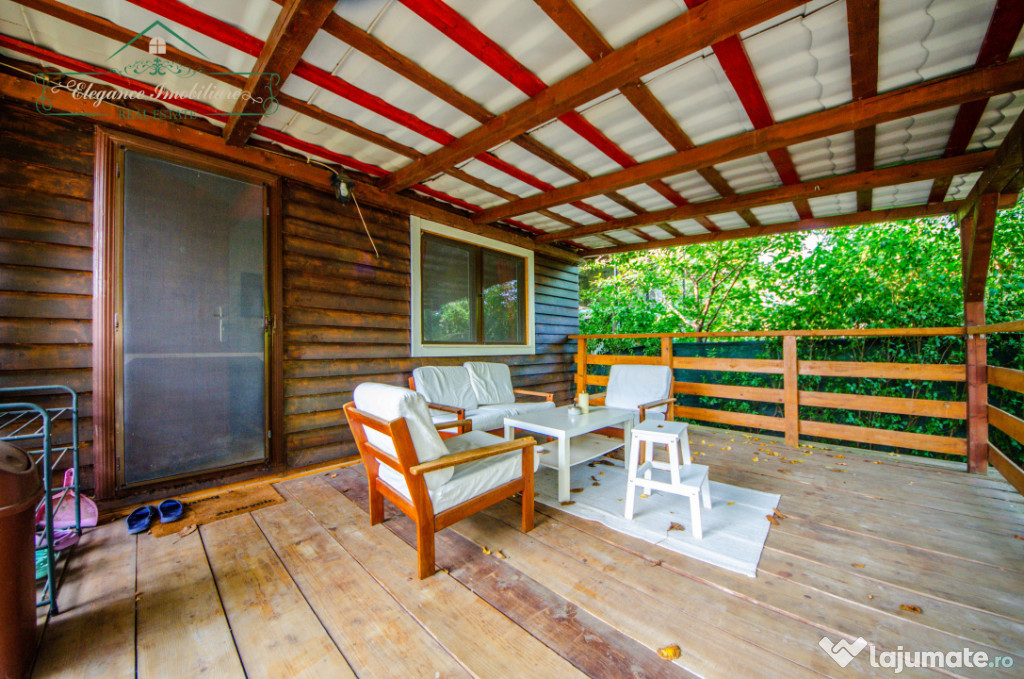 Punctul forte al acestei proprietăți este spațiul exterior dedicat relaxării. Vă așteaptă o terasă acoperită de 18 mp cu mobilier de exterior, ideală pentru dimineți liniștite sau seri petrecute cu prietenii. Curtea include și o zonă de foc de tabără/fire pit pentru seri de neuitat, dar și o anexă (magazie). Exteriorul din lemn al casei de vacanță, înconjurat de vegetație luxuriantă, completează perfect cadrul.