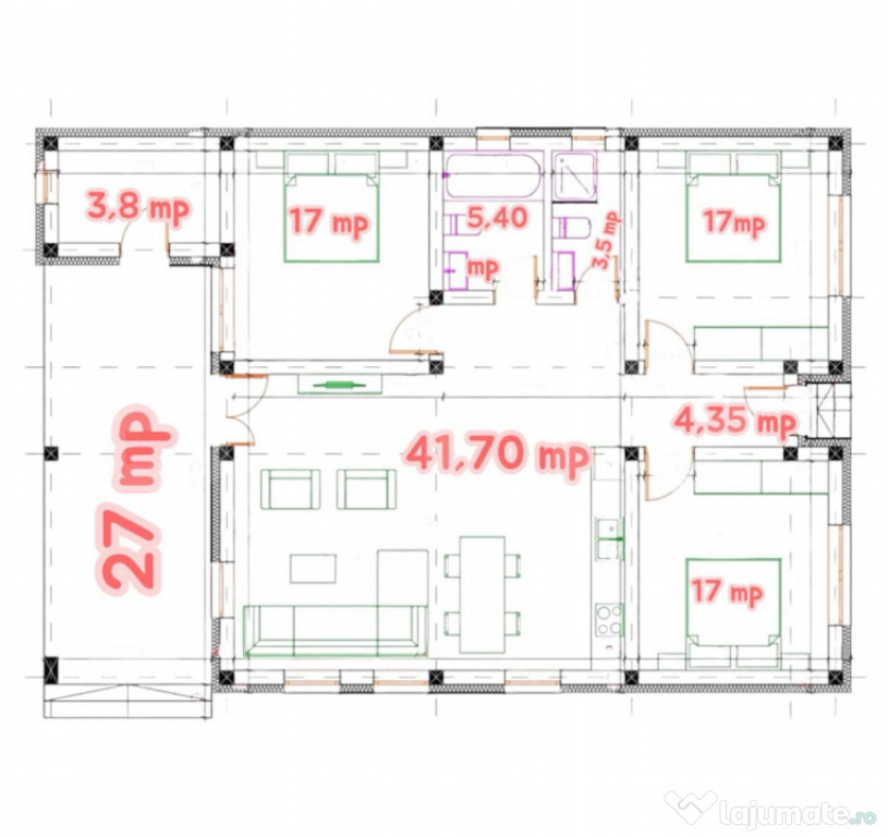 3 dormitoare spațioase, fiecare cu aproximativ 17 mp