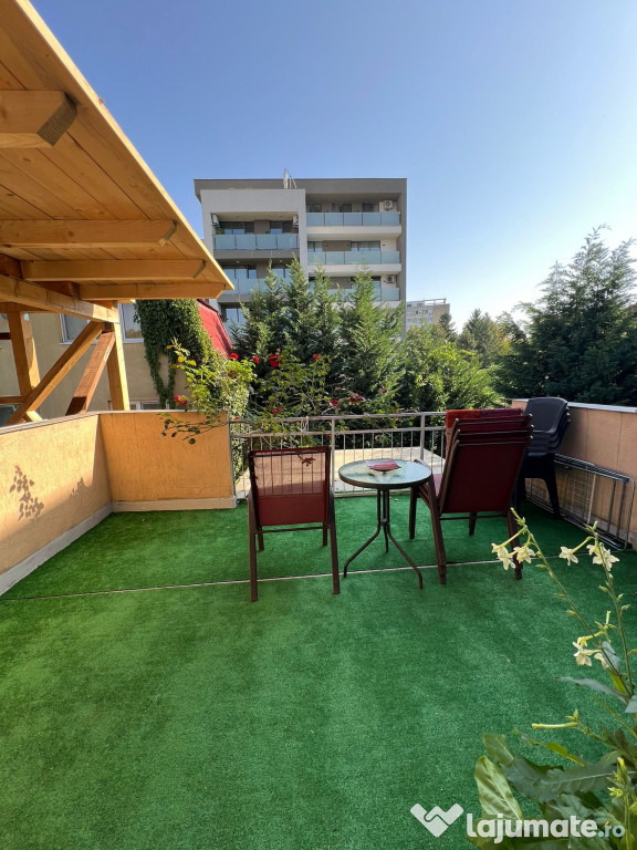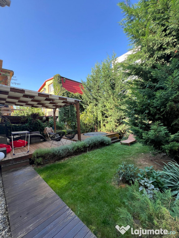 În partea din spate se află o terasă acoperită, amenajată cu jacuzzi și zonă de grătar – un spațiu perfect pentru relaxare. Curtea permite parcarea a două autoturisme.
