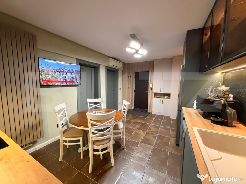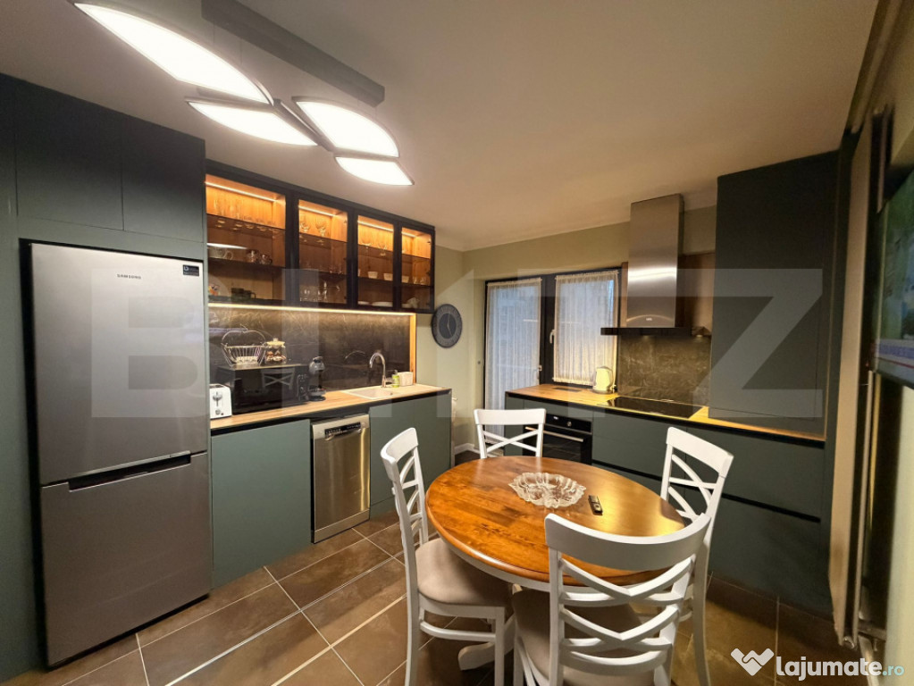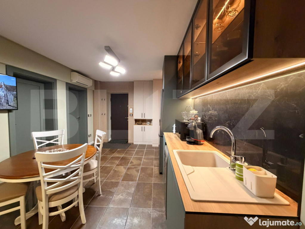 Bucătăria este spațioasă, dotată cu electrocasnice premium: mașină de spălat vase, mașină de spălat rufe, aparat de cafea, precum și veselă completă — un ecosistem bine structurat pentru un stil de viață modern.