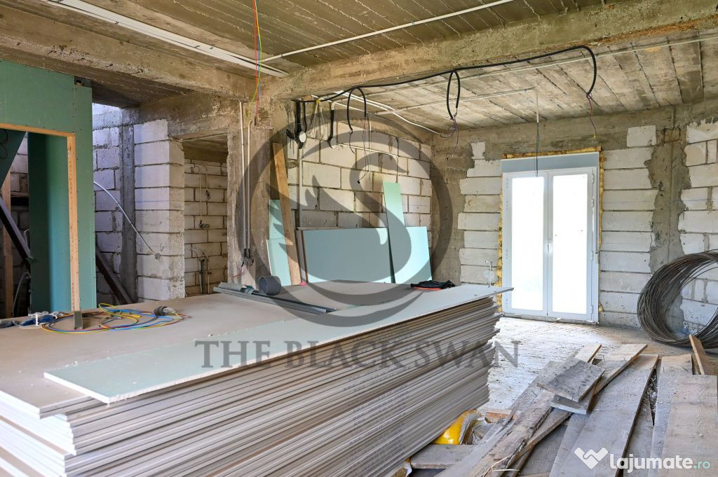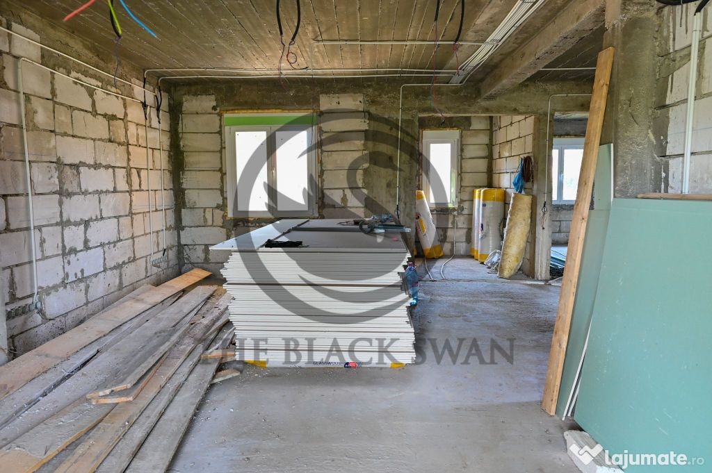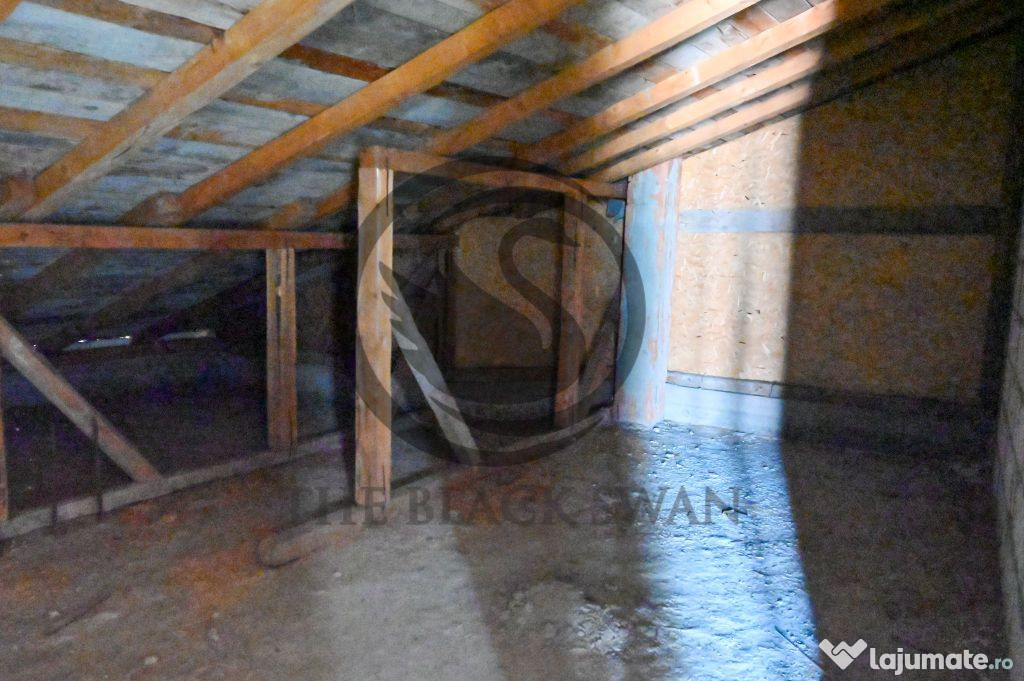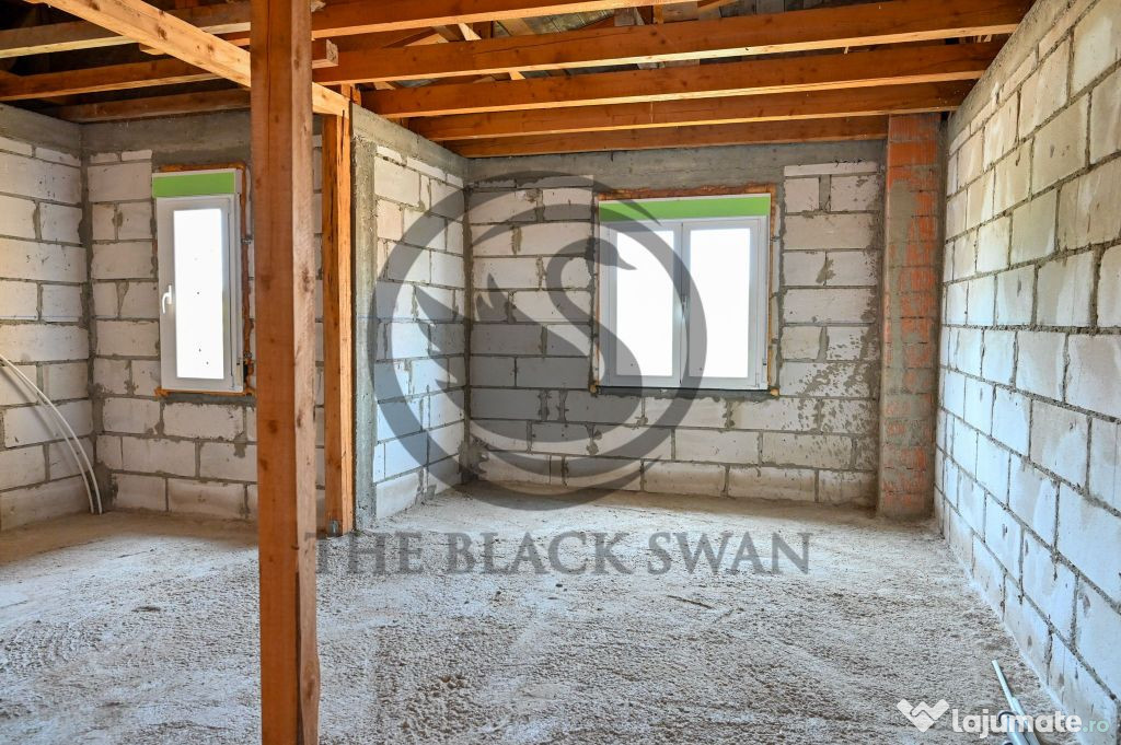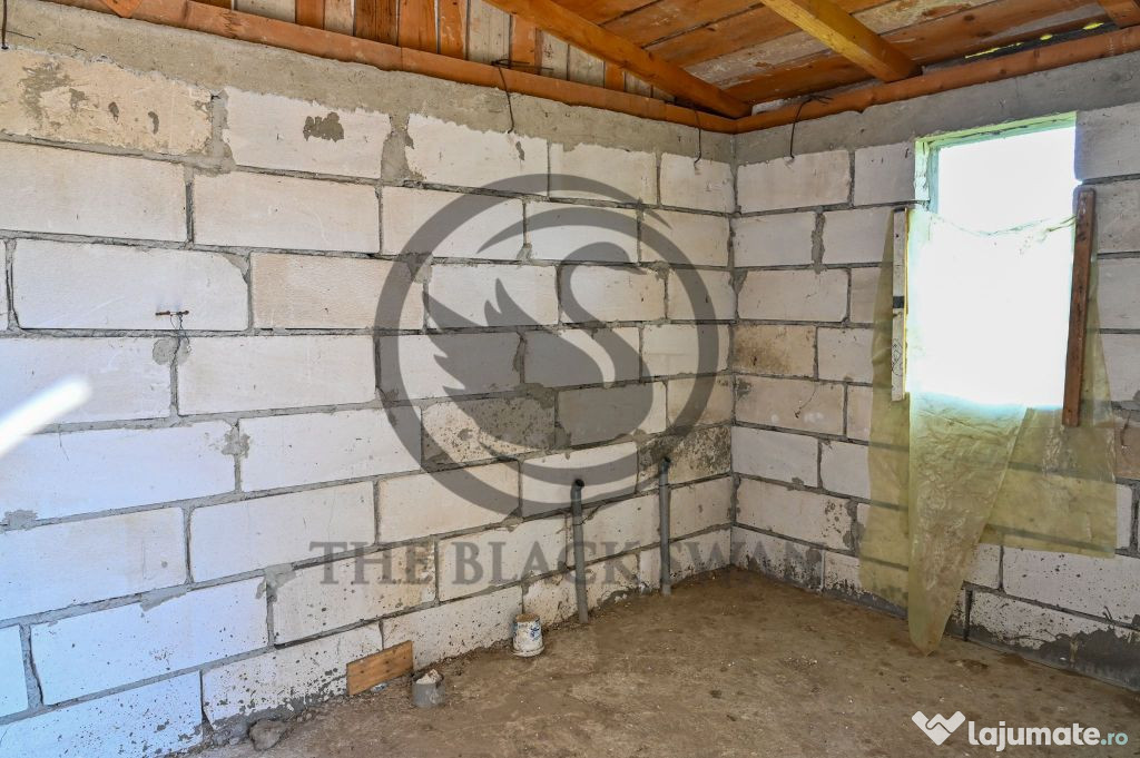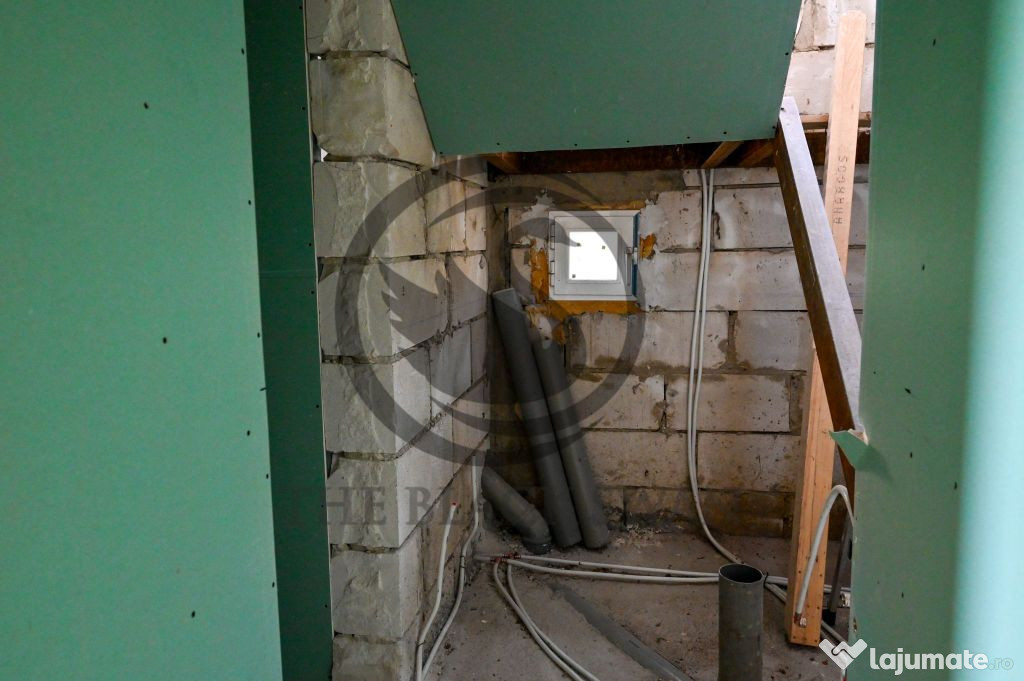 Parterul este deja organizat și cuprinde o bucătărie, un living spațios, un dormitor cu baie proprie și o baie de serviciu. De aici se poate ieși direct pe terasa care oferă acces către curtea generoasă, un spațiu potrivit pentru relaxare și activități în aer liber. Etajul mansardat nu a fost compartimentat, oferind libertatea totală de a crea spațiul dorit, fie că este vorba despre dormitoare, birou, zonă de hobby sau un open-space generos. Camera tehnică este amplasată separat, lângă casă, facilitând astfel organizarea eficientă a spațiilor interioare.