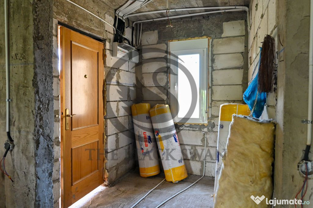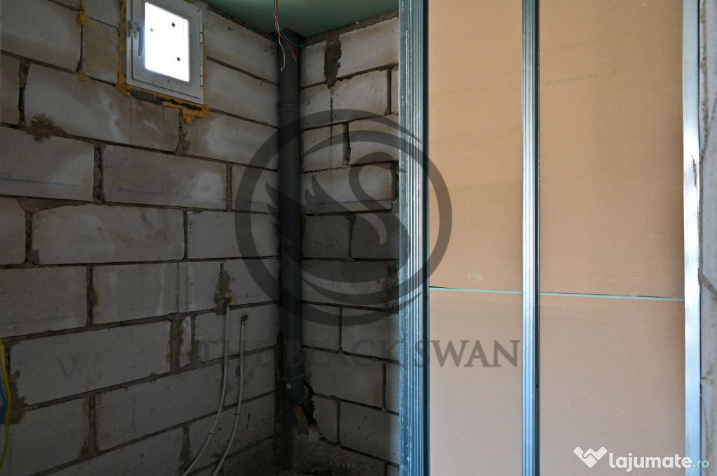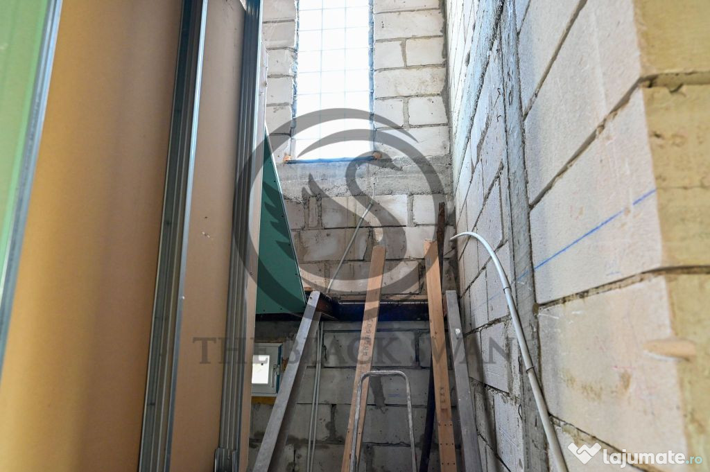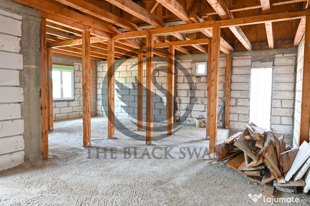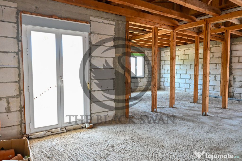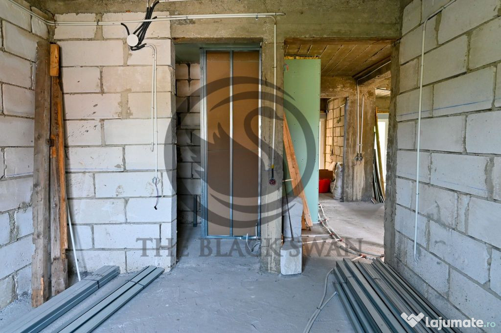 Parterul este deja organizat și cuprinde o bucătărie, un living spațios, un dormitor cu baie proprie și o baie de serviciu. De aici se poate ieși direct pe terasa care oferă acces către curtea generoasă, un spațiu potrivit pentru relaxare și activități în aer liber. Etajul mansardat nu a fost compartimentat, oferind libertatea totală de a crea spațiul dorit, fie că este vorba despre dormitoare, birou, zonă de hobby sau un open-space generos. Camera tehnică este amplasată separat, lângă casă, facilitând astfel organizarea eficientă a spațiilor interioare.