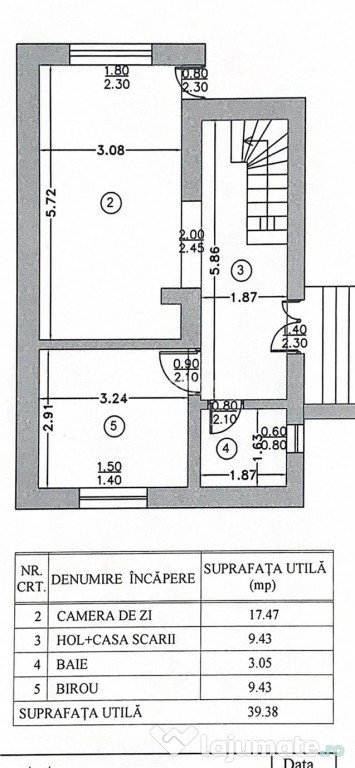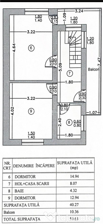 - etaj cu o suprafata totala de 50.63 mp, suprafata utila 40.27 mp, compus din 2 dormitoare, baie, hol plus casa scarii
