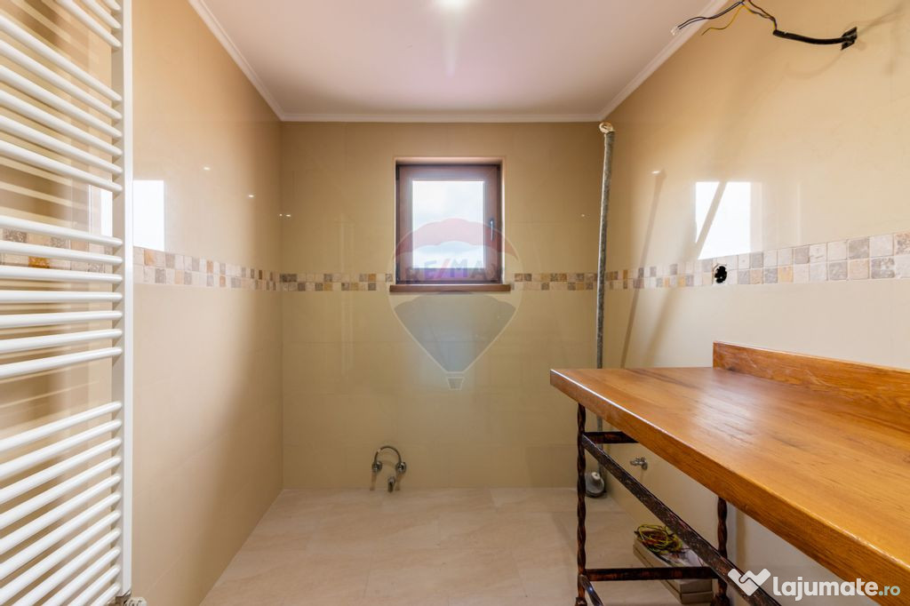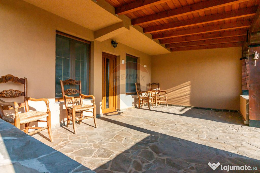 Casa este finalizată și finisată clasic, cu spații luminoase și vitrate mari, oferind o atmosferă caldă și primitoare. Terasa de la intrare este amplă și orientată superb către curte, creând o zonă ideală pentru relaxare.