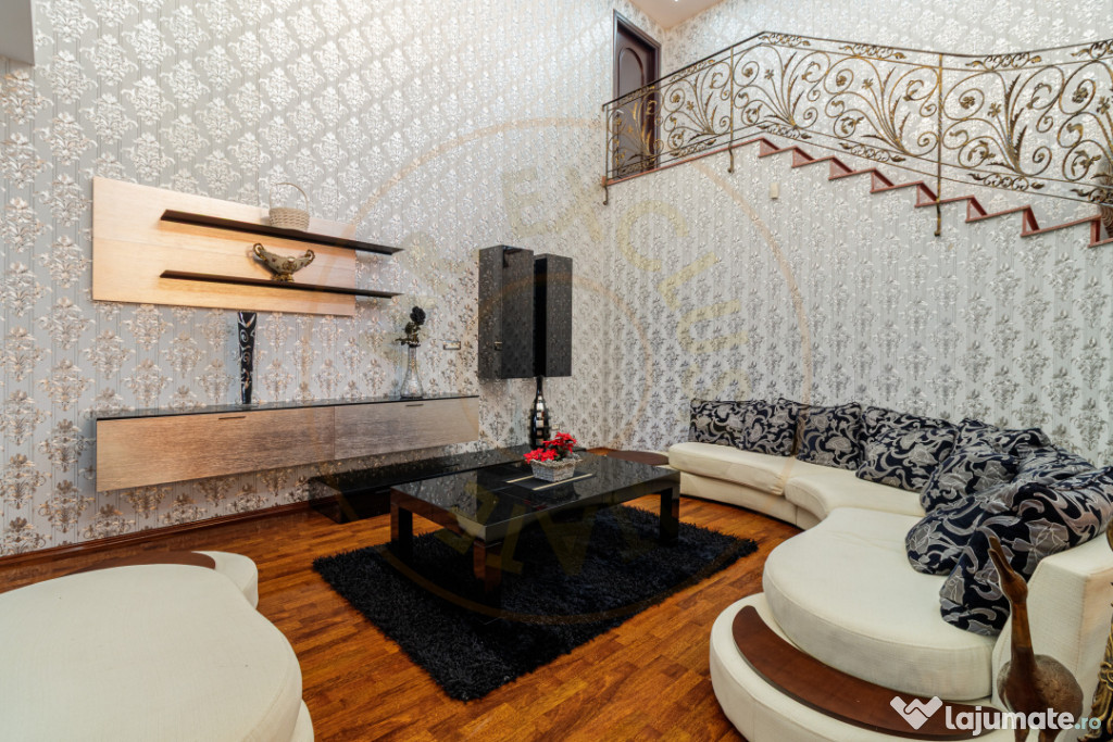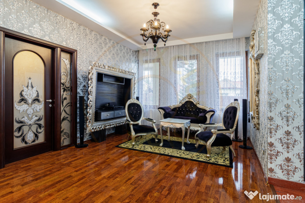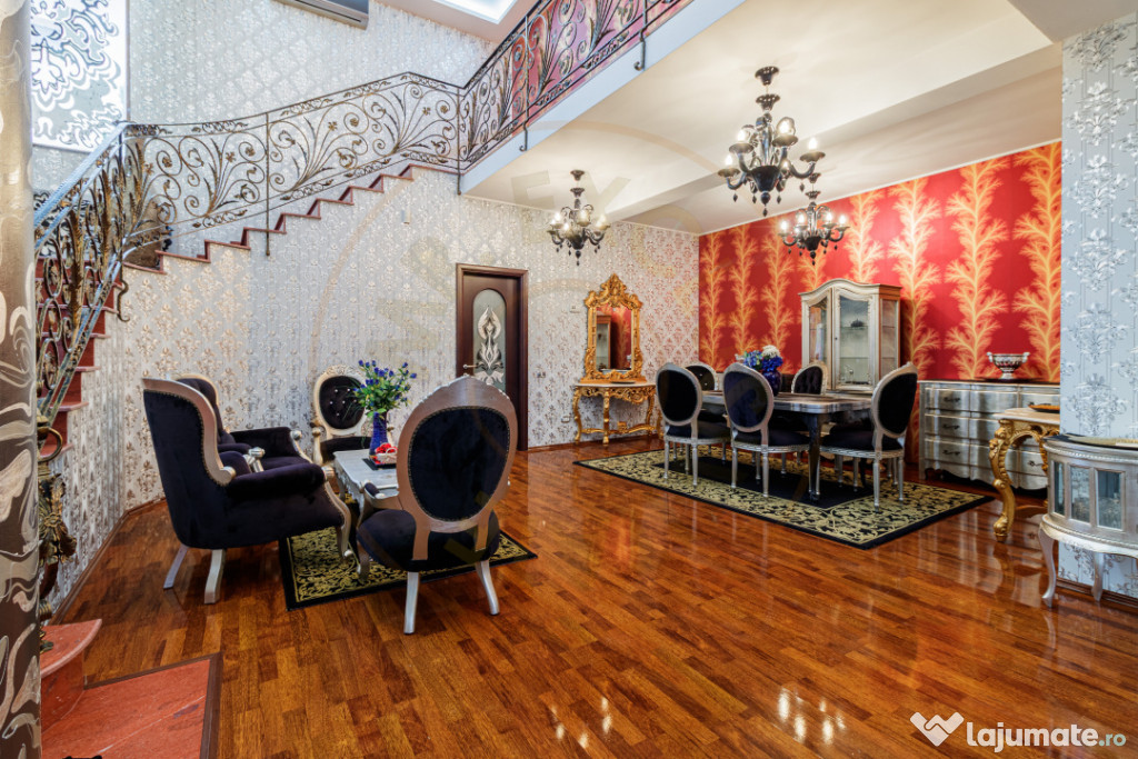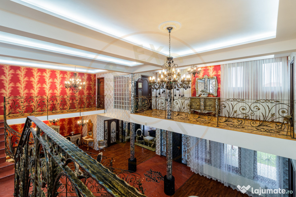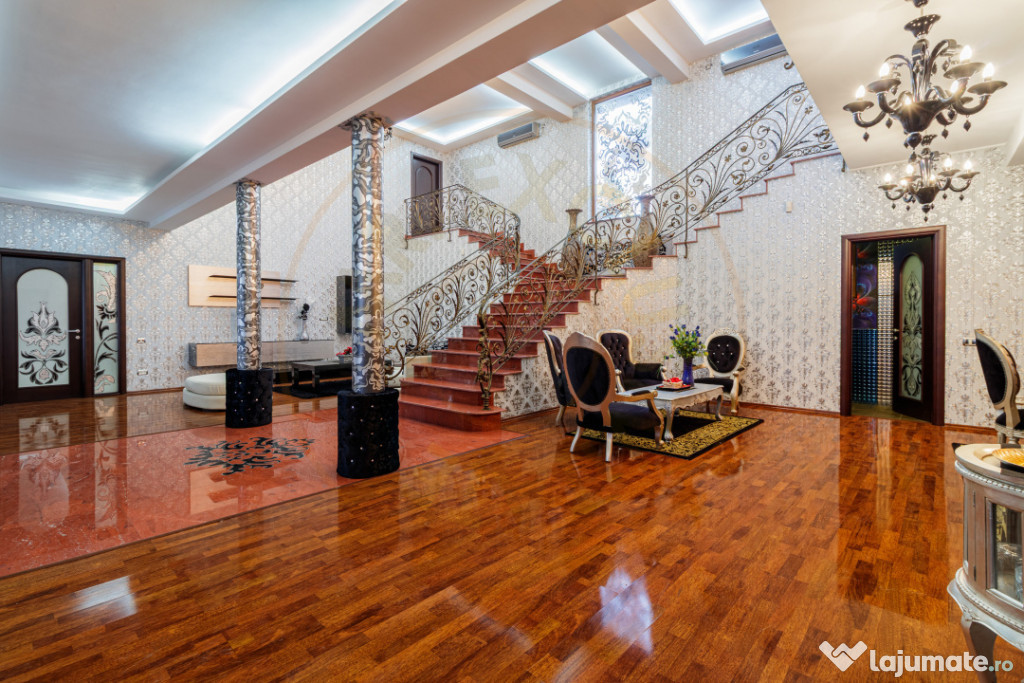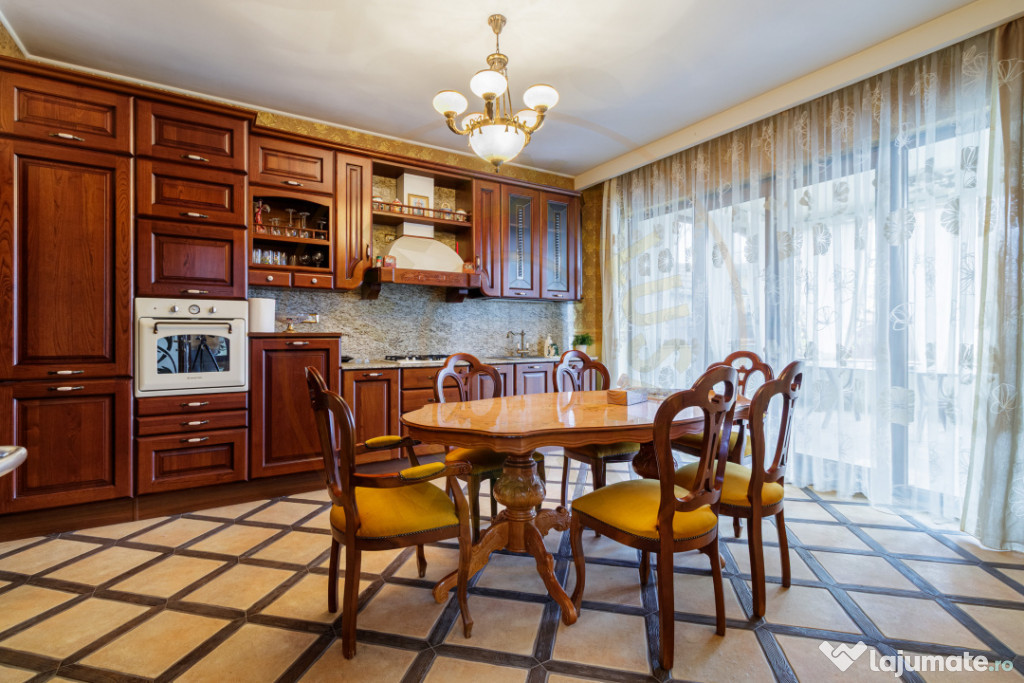Interiorul oferă un living foarte generos, cu scara principală ca element central, feronerie lucrată manual și zone de relaxare distincte. Bucătăria este spațioasă, din lemn masiv, cu zonă de dining inclusă și acces direct către terasă.
