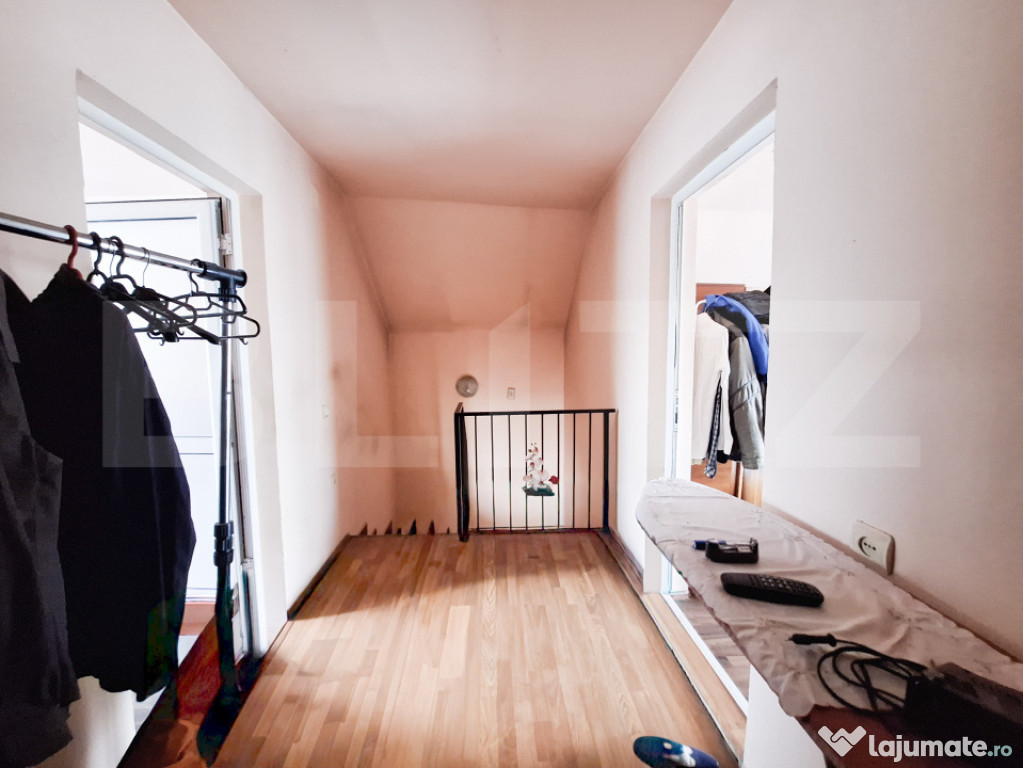 Blitz propune spre vanzare casă individuală P+E, cu grădină generoasă, în Apahida. Construită în anul 2000, casa este amplasată pe un teren de 615 mp și are o suprafață utilă de 100 mp, desfășurată pe un regim de înălțime Parter + Etaj. Realizată pe fundații din beton, cu pereți din BCA, acoperiș tip șarpantă din lemn și învelitoare din șindrilă bituminoasă, construcția oferă o structură solidă și durabilă.Compartimentare: