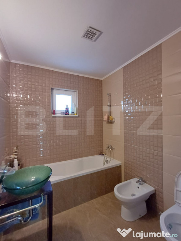 Incalzirea se face cu centrala termica pe gaz. Proprietatea este dotata cu incalzire in pardoseala; la parter incalzire in pardoseala Uponor, iar la etaj incalzire in pardoseala Rehau cu automatizare Rehau. In fiecare camera temperatura se poate regla separat, fiind dotate cu termostate individuale. Tavanul intre parter si mansarda este izolat cu vata minerala si rigips, iat tavanul intre mansarda si pod cu vata minerala de 15 cm. Acoperis din tigla. Curtea cu trotuare, pavata partial cu zona de spatiu verde si barbeque. Terasa este spatioasa cu zona de luat masa.