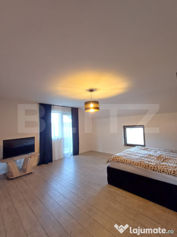 Blitz vă propune spre vânzare o proprietate deosebită, cu suprafata totala de 338 mp locuibili, amplasata pe un teren de 1400 mp, situata într-o zonă cu potențial remarcabil pentru investiții.Imobilul este construit in 2021, din caramida si are regim de inaltime S+P+E. La subsol avem pivnita, camera tehnica, crama in curs de finalizare si hol cu scari interioare. La parter avem un hol la intrare, o bucatarie open space cu camara, 1 baie, camera de zi spatioasa cu zona de dining si iesire pe terasa acoperita de circa 28 mp. La etaj avem 3 dormitoare, din care unul cu dressing, iesire pe balcon si baie proprie, un dormitor cu iesire pe balcon, inca o baie si hol. Proprietatea are geamuri termopan, este izolata la exterior cu polistiren de 10 cm iar podul este izolat cu vata bazaltica.