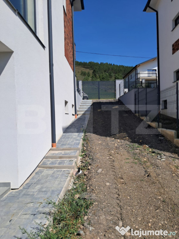 Exterior: finisat complet (tencuială decorativă, izolație, balustrade sticlă la balcon, terase placate, sistem scurgere ape pluviale, teren împrejmuit și amenajat cu 2 locuri de parcare)