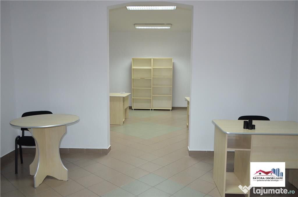 La parter de afla: trei spatii comerciale, doua birouri, un vestiar, o baie si un hol.