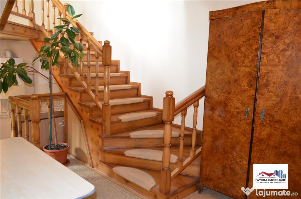 Accesul la etaj si la mansarda se face pe o scara interioara de lemn masiv din stejar.