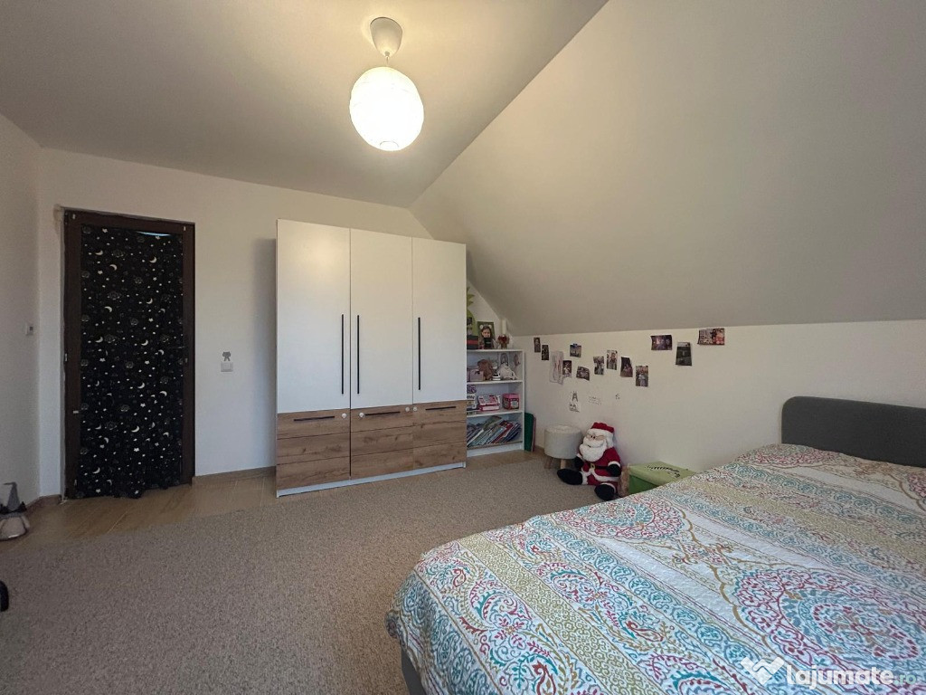 Etajul găzduiește două dormitoare spațioase, ambele cu ieșire către terasă, o baie și acces către mansarda utilizabilă, ideală ca spațiu de hobby, birou sau depozitare suplimentară.