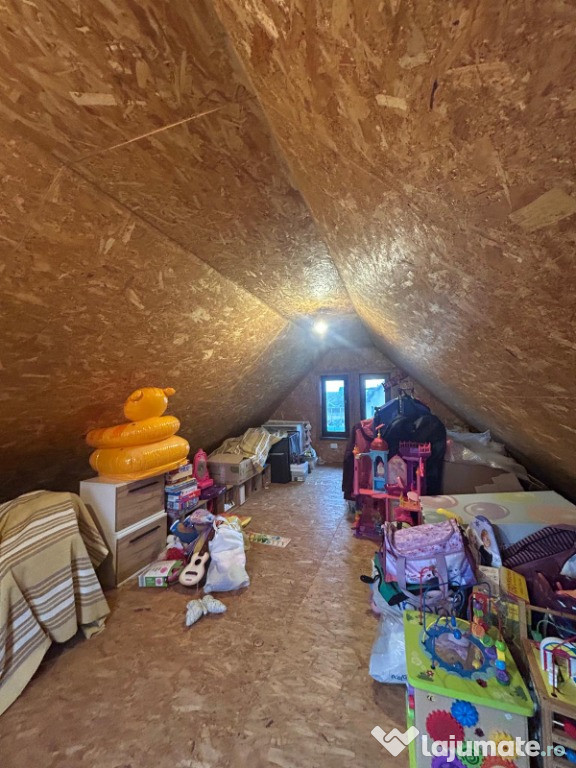 Colosseum Imob Invest vă propune spre vânzare o casă individuală elegantă și eficientă energetic, situată într-o zonă liniștită și sigură, predominant de familii, la ieșirea din Sânpetru către Bod, imediat după spitalul Regina Maria. Proprietatea beneficiază de acces direct la drum pavat, iar poziționarea excelentă permite un acces rapid către Brașov.Casa este amplasată pe un teren generos de 806 mp, având o amprentă la sol de 60 mp și o suprafață totală de 95 mp, la care se adaugă o mansardă utilizabilă de aproximativ 30 mp. Construcția este realizată pe structură din lemn, cu spumă izolatoare între plăcile OSB și izolație exterioară din polistiren de 10 cm, fapt ce îi conferă o clasă energetică B și costuri reduse de întreținere.