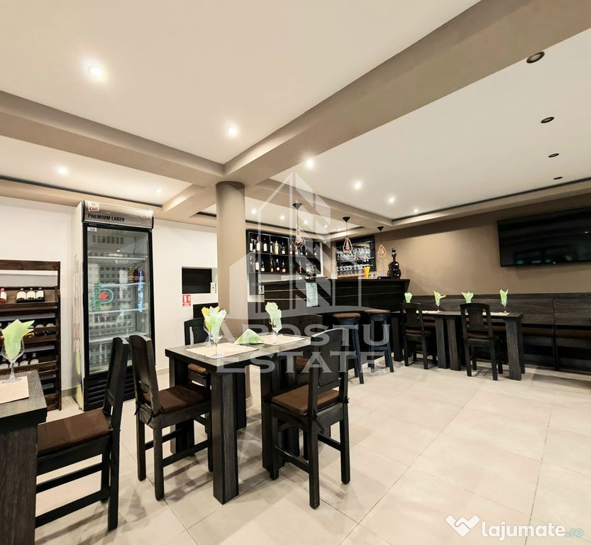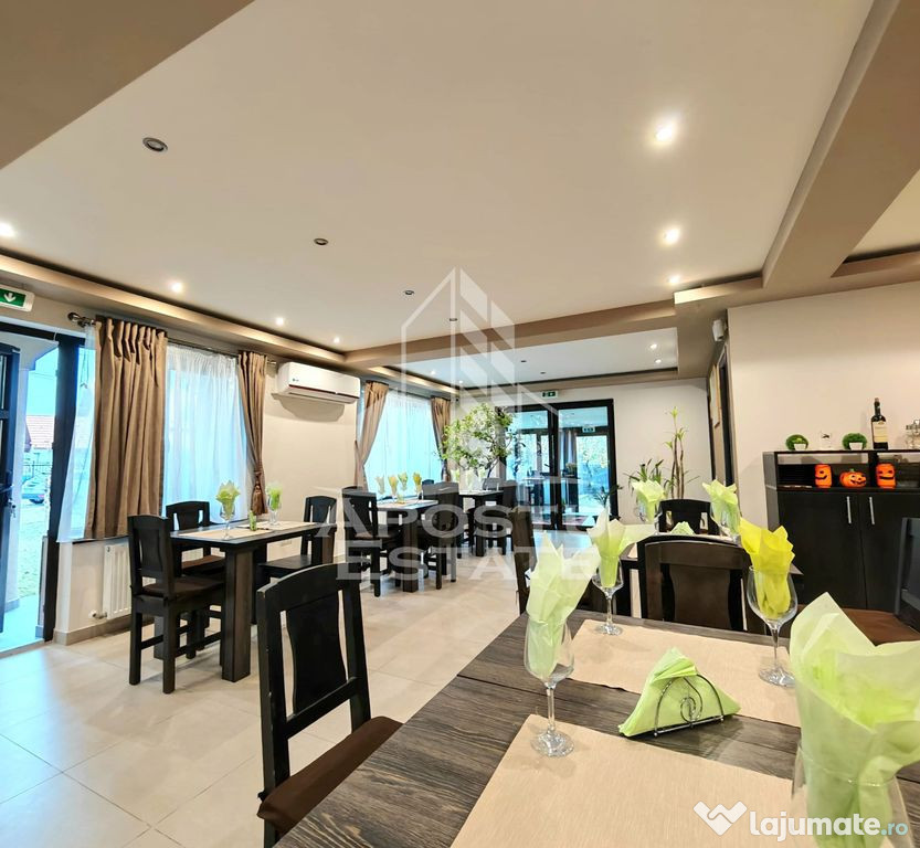 Restaurantul este dotat cu 20 de mese, 60 de scaune, 5 canapele, aer conditionat, sistem de alarma, bar amenajat si centrala proprie Ariston de 30 kW. Bucataria este echipata cu aragaz profesional, friteuza, malaxor pentru pizza, grill, cuptor pizza 4x4 (8 pizza simultan), feliator, cantar si vitrina frigorifica. Afacerea poate fi preluata complet cu firma, echipamente si tot ce este necesar pentru continuarea activitatii.