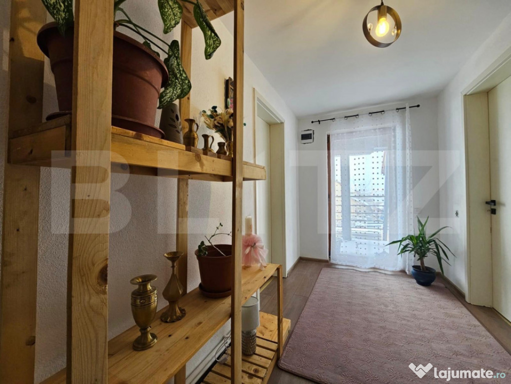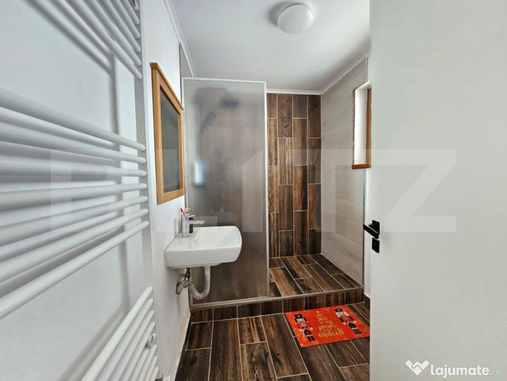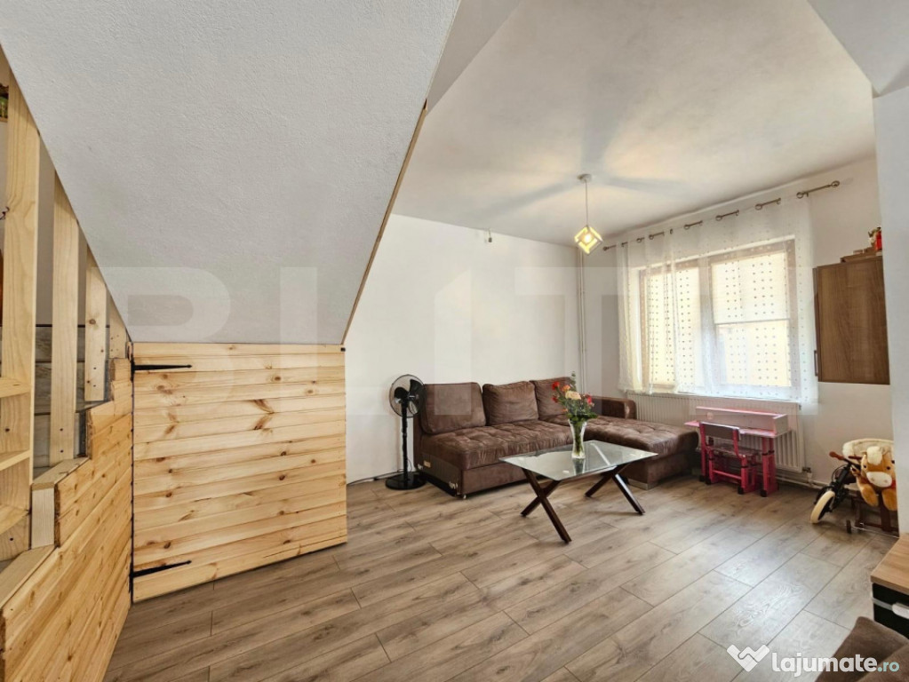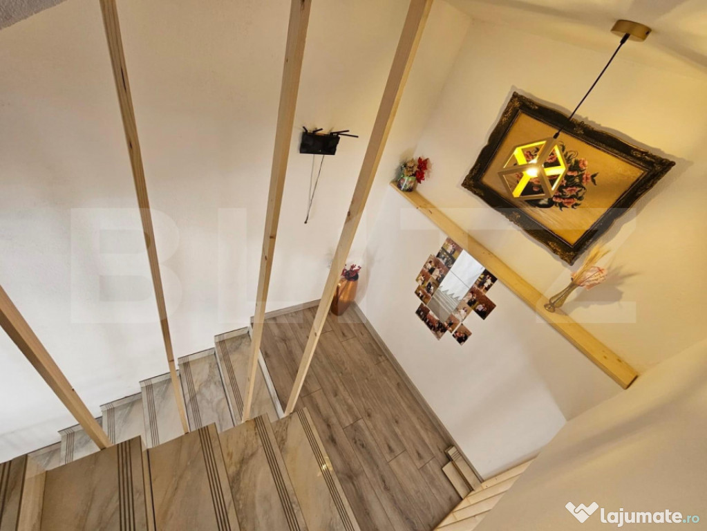 Accesul către etaj se face printr-o scară interioară elegantă, iar imobilul beneficiază de două balcoane cu o priveliște frumoasă asupra împrejurimilor.