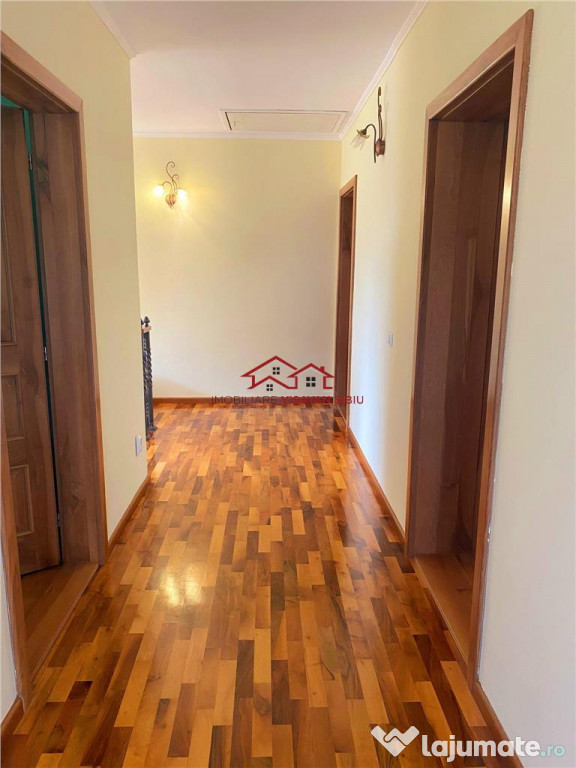 - holul, bucataria si baile sunt pavate cu gresie, iar in restul casei podelele sunt din lemn masiv de stejar