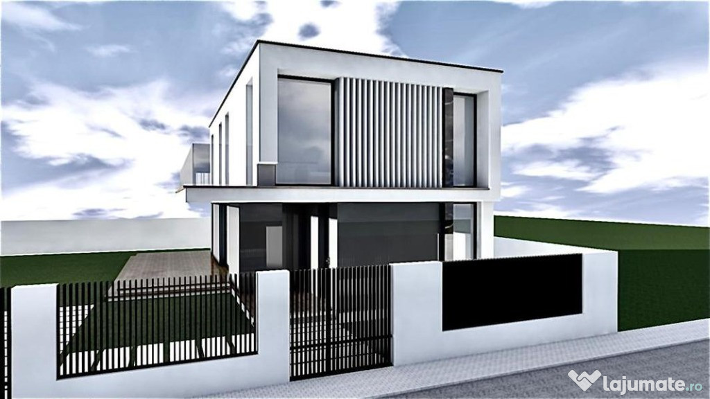 -Design arhitectural contemporan – fațadă minimalistă cu linii curate, combinație elegantă alb–antracit, geamuri mari pe două niveluri, terasă generoasă de 25 mp și gard perimetral din beton cu porți metalice moderne
