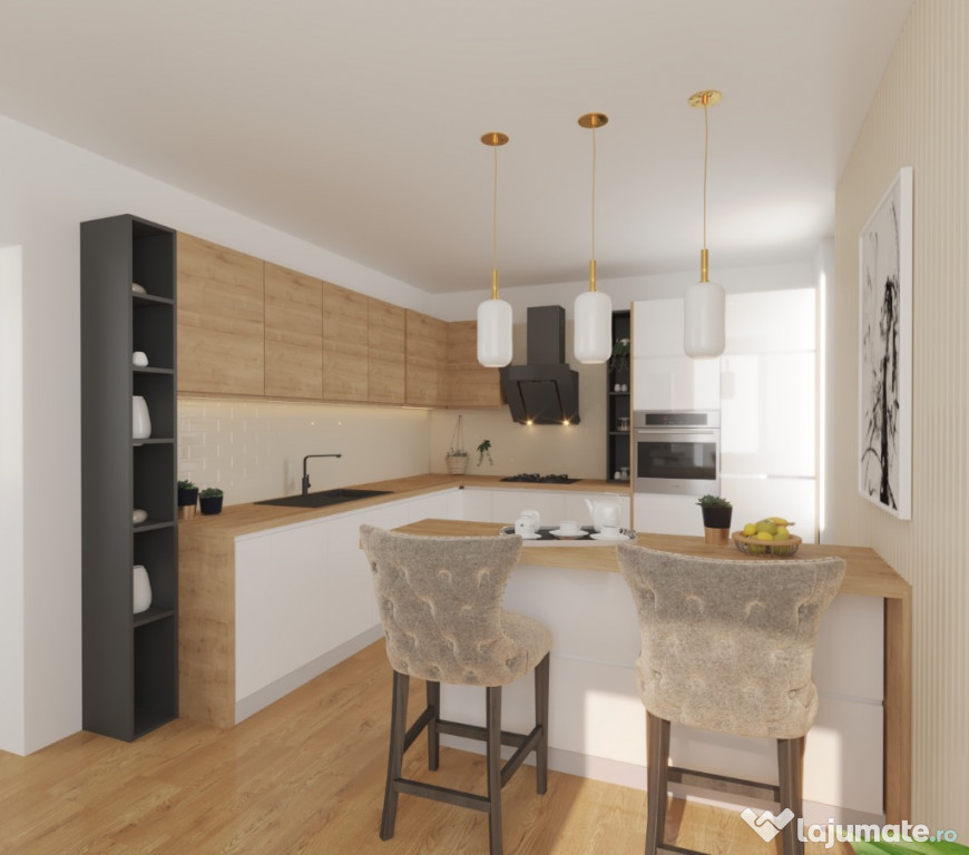 -Bucătărie open space – cu insulă centrală, multiple spații de depozitare și posibilitate de amenajare modernă